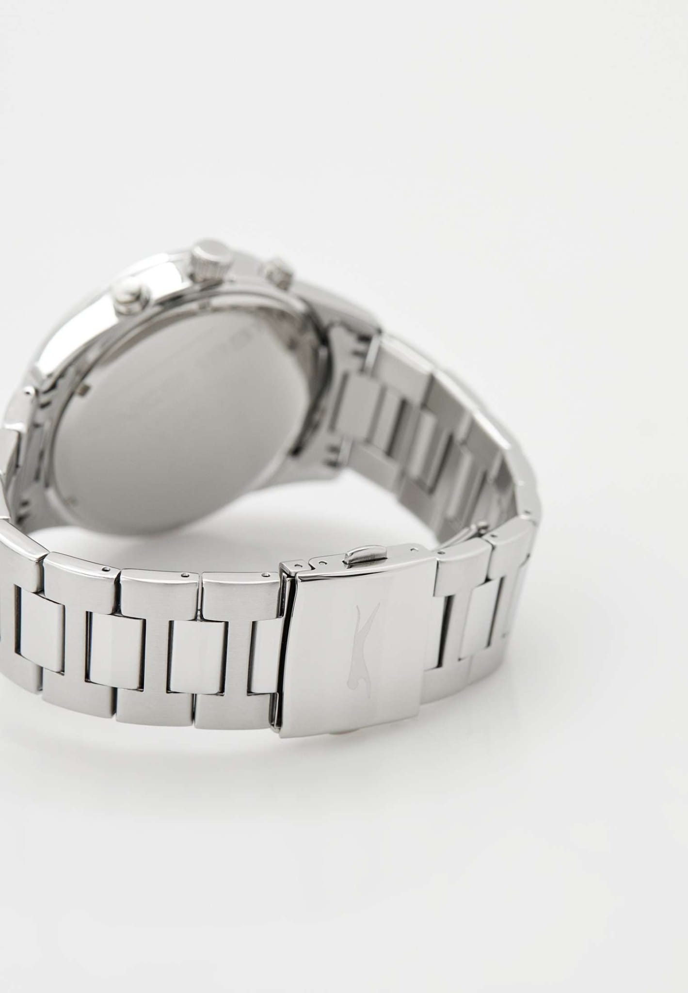 Часы Slazenger SL.09.2242.2.03 – это стильная и надежная модель, созданная для современных мужчин, ценящих качество и функциональность. Корпус и браслет выполнены из прочного металла серебряного цвета, что придает аксессуару элегантный внешний вид и обеспечивает долговечность. Часы фиксируются на руке с помощью браслета с удобной раскладной застёжкойРаскладная застёжкаТакой тип застёжки используется только на браслетах из металла. Она никогда не раскрывается полностью, происходит разделение на 2 и более частей. Раскладывающая застёжка снизит вероятность потери часов к минимуму.. Кварцевый механизм гарантирует точность хода, а минеральное стеклоМинеральное стеклоМинеральное стекло представляет собой искусственно выращенный минерал кварца. Такое стекло отличается особой устойчивостью к повреждениям и царапинам. Уступает по некоторым качествам сапфировому стеклу. защищает синий циферблат от царапин и повреждений. Диаметр корпуса составляет 46 мм, толщина – 13 мм, ширина ремешка – 24 мм, а вес часов – 146 грамм, что делает их удобными для повседневного ношения. Водозащита уровня WR 50 позволяет не снимать часы во время мытья рук и при незначительном контакте с водой. Для удобства использования в темное время суток предусмотрено люминесцентное покрытиеЛюминесцентное покрытиеПозволяет считывать показания времени в темноте. Производители наносят на стрелки, часовые индексы, безель или поверхность циферблата светонакопительный состав, дающий холодное свечение. стрелок. Модель оснащена дополнительными циферблатами, отображающими дату, день недели и текущее время в 24-часовом формате.
