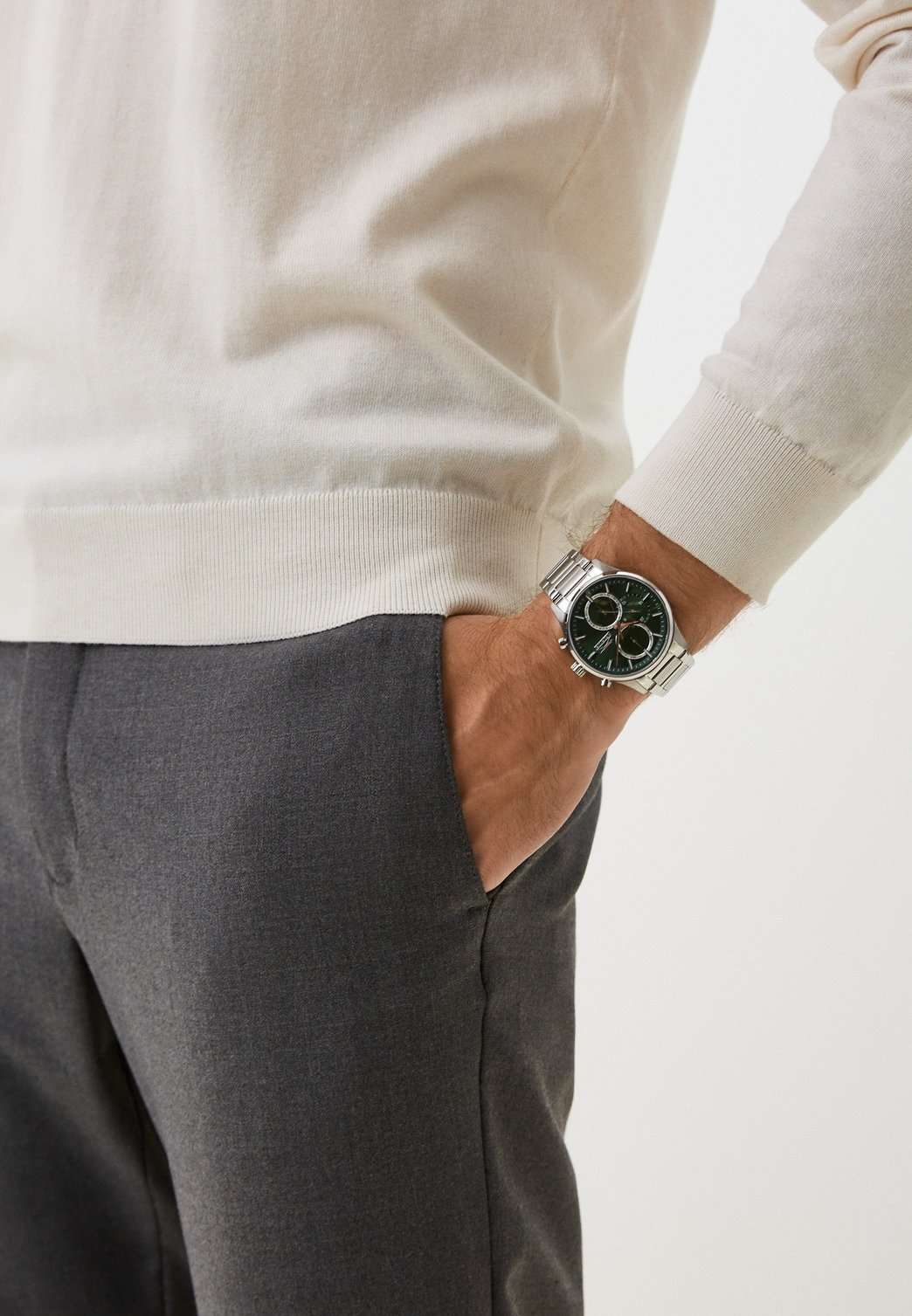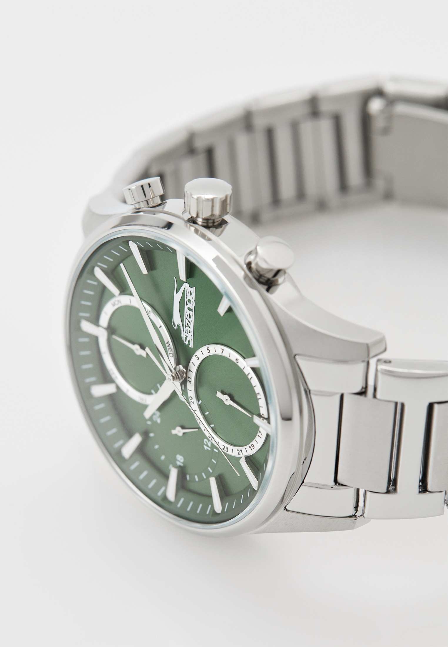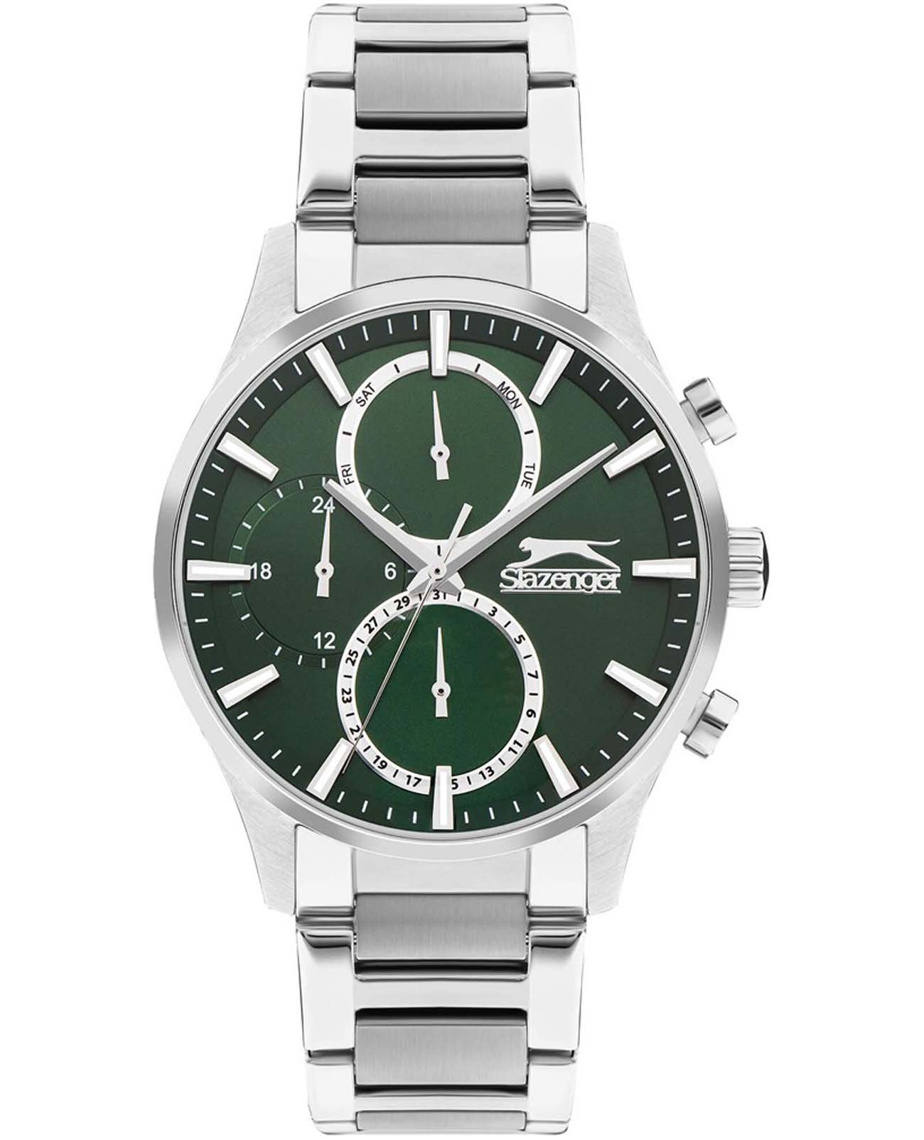 Часы Slazenger SL.09.2283.2.01 — это стильный и надежный аксессуар, который подчеркивает индивидуальность своего владельца. Корпус и браслет выполнены из прочного суперметалла — инновационного сплава на основе меди с пониженным содержанием цинка и никеля, дополненного специальным покрытием для долговечности и эстетики. Зеленый циферблат надежно защищен минеральным стекломМинеральное стеклоМинеральное стекло представляет собой искусственно выращенный минерал кварца. Такое стекло отличается особой устойчивостью к повреждениям и царапинам. Уступает по некоторым качествам сапфировому стеклу., устойчивым к царапинам и механическим повреждениям. Модель оснащена кварцевым механизмом, что гарантирует высокую точность хода. На отдельные циферблаты вынесены указатели 24-часового времени, даты и дня недели, что делает использование часов особенно удобным в повседневной жизни. Стальной браслет с раскладной застёжкойРаскладная застёжкаТакой тип застёжки используется только на браслетах из металла. Она никогда не раскрывается полностью, происходит разделение на 2 и более частей. Раскладывающая застёжка снизит вероятность потери часов к минимуму. обеспечивает комфортную посадку. Водозащита 5 АТМ позволяет не беспокоиться о случайных брызгах или дожде. Метки с люминесцентным покрытиемЛюминесцентное покрытиеПозволяет считывать показания времени в темноте. Производители наносят на стрелки, часовые индексы, безель или поверхность циферблата светонакопительный состав, дающий холодное свечение. удобно подсвечиваются в темноте после зарядки на свету. Диаметр корпуса составляет 43 мм, толщина — 13 мм, что обеспечивает комфортное ношение на запястье. Часы станут отличным выбором для повседневного использования или дополнения к деловому образу, а также послужат отличным подарком на любой праздник.