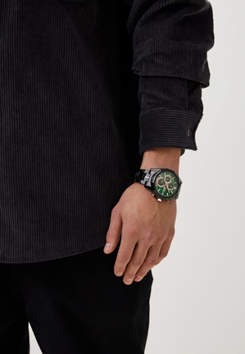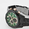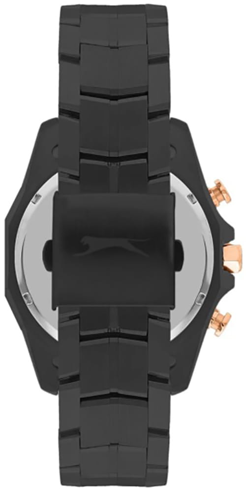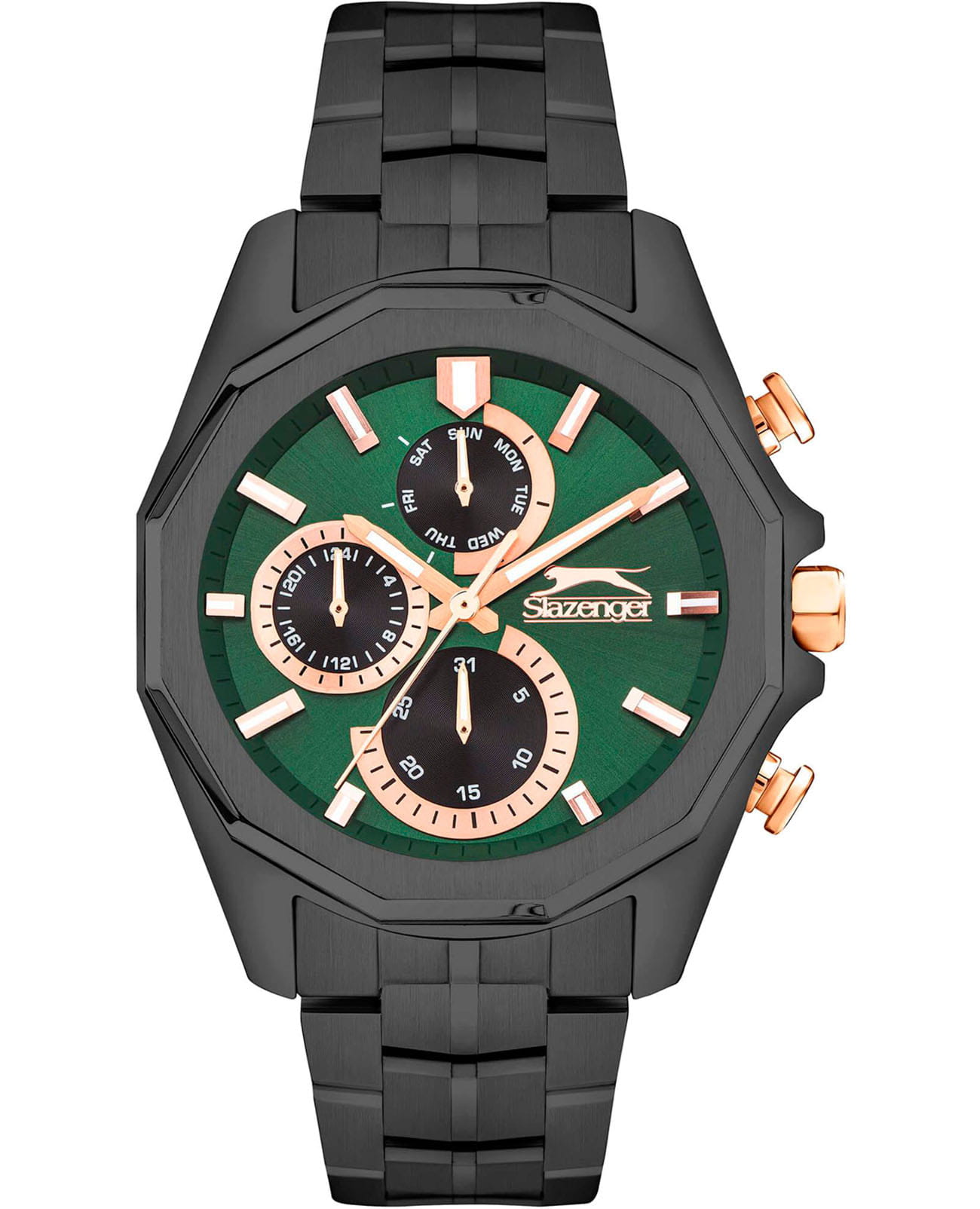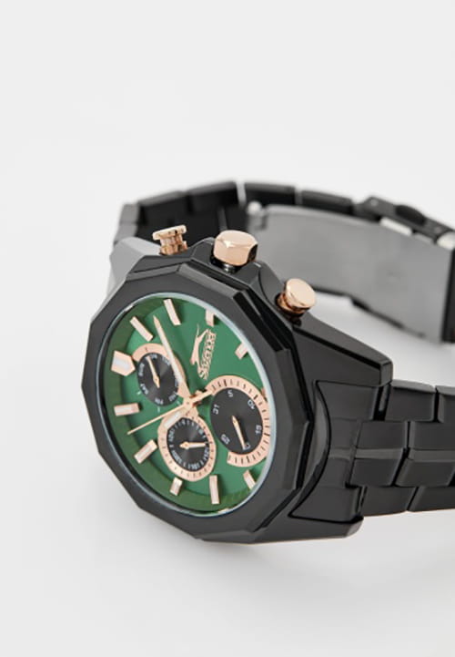 Мужские кварцевые часы Slazenger SL.09.2312.2.05 — это выразительный и функциональный аксессуар, сочетающий прочность, стиль и насыщенную комплектацию. Корпус и браслет выполнены из суперметалла с IP-покрытиемIP-покрытиеМетод ионного напыления. Демонстрирует повышенную устойчивость к истиранию, окислению и химическим веществам. Под воздействием высокого давления и температуры около 1500°C молекулы металла надёжно соединяются с частицами корпуса часов. чёрного цвета, защищён минеральным стекломМинеральное стеклоМинеральное стекло представляет собой искусственно выращенный минерал кварца. Такое стекло отличается особой устойчивостью к повреждениям и царапинам. Уступает по некоторым качествам сапфировому стеклу.. Циферблат зелёного цвета оформлен с вынесенными малыми циферблатами для индикации дня недели, даты и времени в 24-часовом формате. Стрелки и метки оснащены люминесцентным покрытиемЛюминесцентное покрытиеПозволяет считывать показания времени в темноте. Производители наносят на стрелки, часовые индексы, безель или поверхность циферблата светонакопительный состав, дающий холодное свечение., обеспечивающим хорошую читаемость в темноте. Безель и гранёная заводная головка с защитой придают модели выразительный внешний вид. Браслет фиксируется на раскладной застёжкеРаскладная застёжкаТакой тип застёжки используется только на браслетах из металла. Она никогда не раскрывается полностью, происходит разделение на 2 и более частей. Раскладывающая застёжка снизит вероятность потери часов к минимуму., обеспечивая удобство и надёжность ношения. Водонепроницаемость 50 м позволяет использовать часы в повседневных условиях, защищая от случайных брызг и капель дождя. Модель подчёркивает индивидуальность владельца и идеально подходит как для повседневного, так и для делового образа.