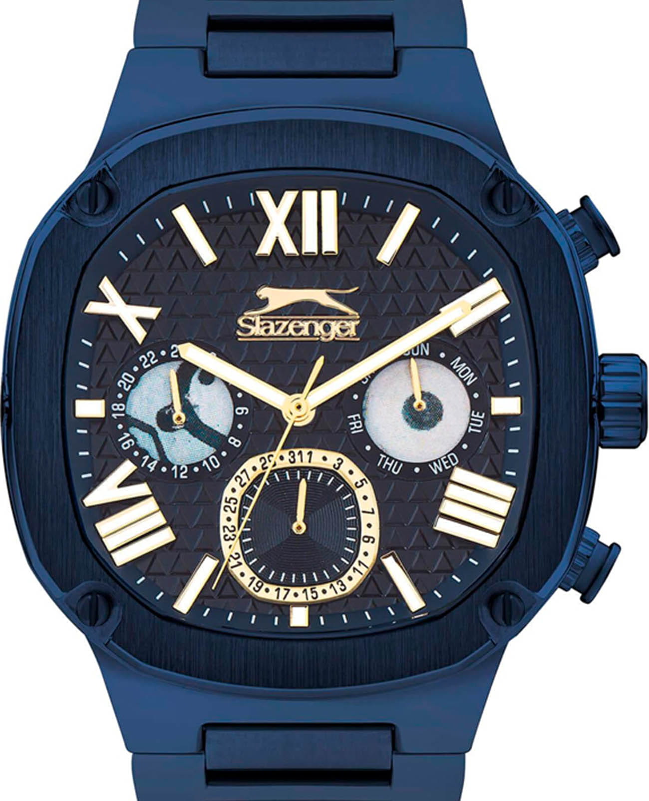 Мужские кварцевые часы Slazenger SL.09.2320.2.04 — это выразительный и функциональный аксессуар, сочетающий стиль, прочность и насыщенную комплектацию. Корпус и браслет выполнены из суперметалла с IP-покрытиемIP-покрытиеМетод ионного напыления. Демонстрирует повышенную устойчивость к истиранию, окислению и химическим веществам. Под воздействием высокого давления и температуры около 1500°C молекулы металла надёжно соединяются с частицами корпуса часов., а циферблат частично скелетонизирован и оформлен в синих тонах, что позволяет наблюдать за работой механизма. Циферблат защищён минеральным стекломМинеральное стеклоМинеральное стекло представляет собой искусственно выращенный минерал кварца. Такое стекло отличается особой устойчивостью к повреждениям и царапинам. Уступает по некоторым качествам сапфировому стеклу. и дополнен вынесенными малыми циферблатами для индикации дня недели, даты и времени в 24-часовом формате. Стрелки и метки оснащены люминесцентным покрытиемЛюминесцентное покрытиеПозволяет считывать показания времени в темноте. Производители наносят на стрелки, часовые индексы, безель или поверхность циферблата светонакопительный состав, дающий холодное свечение., обеспечивающим хорошую читаемость в темноте. Завинчивающаяся задняя крышка повышает надёжность конструкции. Браслет из суперметалла фиксируется на раскладной застёжкеРаскладная застёжкаТакой тип застёжки используется только на браслетах из металла. Она никогда не раскрывается полностью, происходит разделение на 2 и более частей. Раскладывающая застёжка снизит вероятность потери часов к минимуму., обеспечивая удобство и безопасность ношения. Водонепроницаемость 50 м позволяет использовать часы в повседневных условиях, защищая от случайных брызг и капель дождя. Модель подчёркивает индивидуальность владельца и идеально подходит как для повседневного, так и для делового образа.