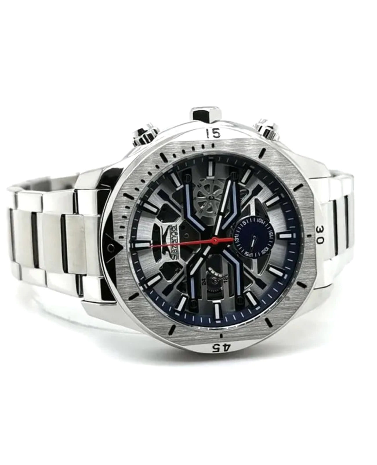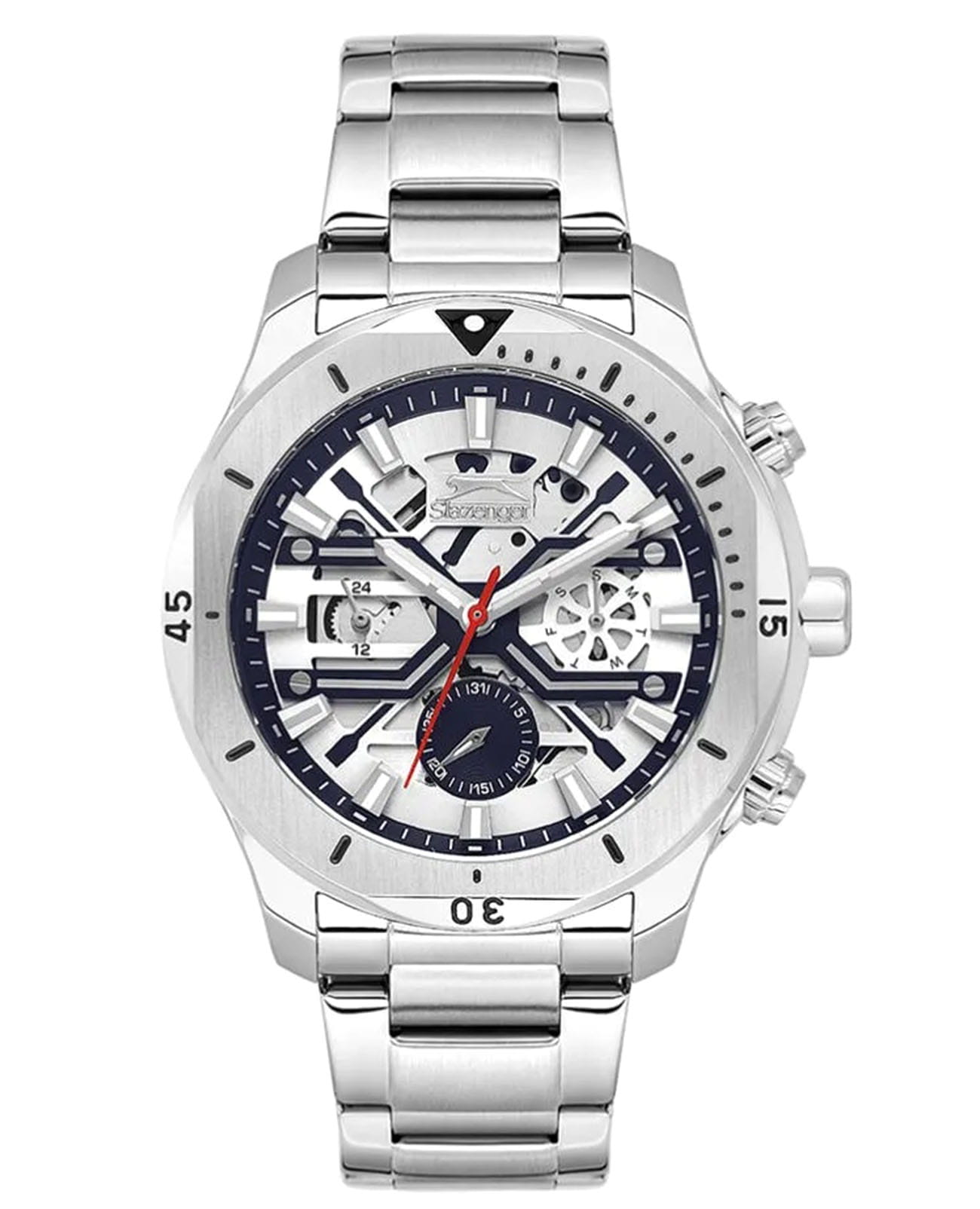 Мужские кварцевые часы Slazenger — это выразительный и функциональный аксессуар. Корпус диаметром 44 мм и толщиной 12 мм выполнен из нержавеющей стали 316L. Циферблат синего цвета частично скелетонизирован. Циферблат защищён минеральным стекломМинеральное стеклоМинеральное стекло представляет собой искусственно выращенный минерал кварца. Такое стекло отличается особой устойчивостью к повреждениям и царапинам. Уступает по некоторым качествам сапфировому стеклу.. Механизм — кварцевый калибр VX9JE1. Часы оснащены индикацией дня недели, даты и 12/24-часового формата времени. Завинчивающаяся задняя крышка обеспечивает дополнительную защиту. Часы оснащены стальным браслетом с раскладной застёжкойРаскладная застёжкаТакой тип застёжки используется только на браслетах из металла. Она никогда не раскрывается полностью, происходит разделение на 2 и более частей. Раскладывающая застёжка снизит вероятность потери часов к минимуму.. Водонепроницаемость 50 м позволяет использовать часы в повседневных условиях. Гарантия — 12 месяцев. Идеальный выбор для тех, кто ценит стиль, функциональность и качество.