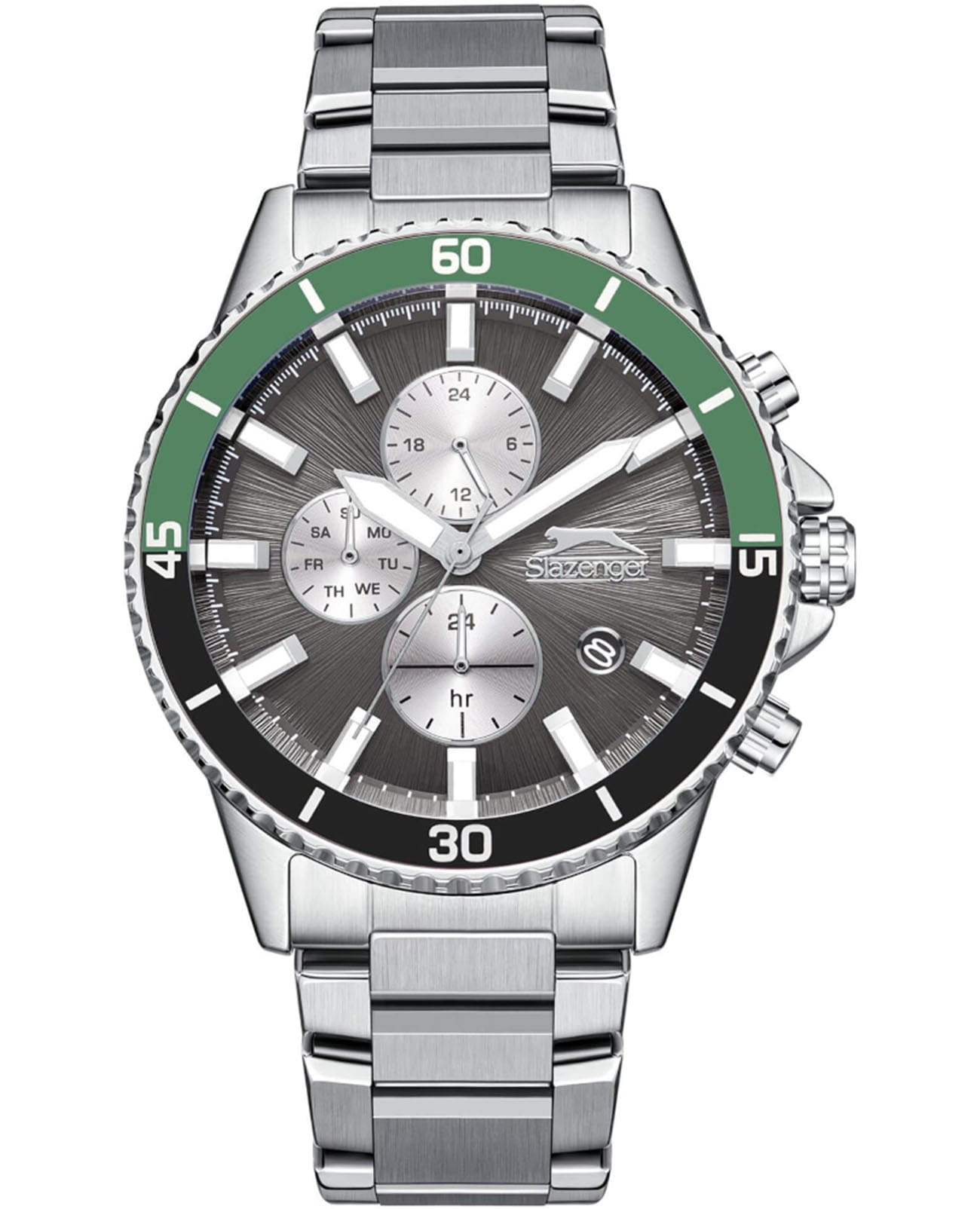 Мужские кварцевые часы Slazenger — это выразительный и функциональный аксессуар. Корпус диаметром 44 мм и толщиной 13 мм выполнен из суперметалла. БезельБезельВнешний ободок, закрепляющий стекло. В спортивных часах так называется поворотное кольцо с делениями на циферблате, выполняет роль таймера – замеряет отрезки времени на шкале. Неподвижный безель – элемент декора. Однонаправленно вращающийся безель на дайверских часах позволяет фиксировать моменты погружения и выныривания на поверхность. из суперметалла с IP-покрытиемIP-покрытиеМетод ионного напыления. Демонстрирует повышенную устойчивость к истиранию, окислению и химическим веществам. Под воздействием высокого давления и температуры около 1500°C молекулы металла надёжно соединяются с частицами корпуса часов.. Циферблат серого цвета оформлен индексами и стрелками. Циферблат защищён минеральным стекломМинеральное стеклоМинеральное стекло представляет собой искусственно выращенный минерал кварца. Такое стекло отличается особой устойчивостью к повреждениям и царапинам. Уступает по некоторым качествам сапфировому стеклу.. Механизм — кварцевый калибр. Часы оснащены индикацией дня недели, даты и 12/24-часового формата времени. Окошко даты расположено между 4 и 5 часами. Часы оснащены браслетом из суперметалла с раскладной застёжкойРаскладная застёжкаТакой тип застёжки используется только на браслетах из металла. Она никогда не раскрывается полностью, происходит разделение на 2 и более частей. Раскладывающая застёжка снизит вероятность потери часов к минимуму.. Водонепроницаемость 100 м позволяет использовать часы для плавания и повседневного ношения. Гарантия — 12 месяцев. Идеальный выбор для тех, кто ценит стиль, функциональность и качество.