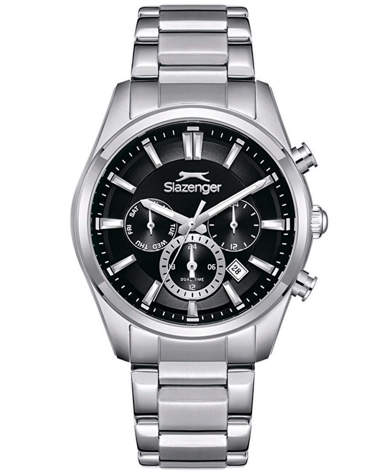 Мужские кварцевые часы Slazenger — это выразительный и функциональный аксессуар. Корпус диаметром 43 мм и толщиной 12 мм выполнен из нержавеющей стали 316L. Циферблат чёрного цвета оформлен индексами и стрелками с люминесцентным покрытиемЛюминесцентное покрытиеПозволяет считывать показания времени в темноте. Производители наносят на стрелки, часовые индексы, безель или поверхность циферблата светонакопительный состав, дающий холодное свечение., обеспечивающим хорошую читаемость в темноте. Циферблат защищён минеральным стекломМинеральное стеклоМинеральное стекло представляет собой искусственно выращенный минерал кварца. Такое стекло отличается особой устойчивостью к повреждениям и царапинам. Уступает по некоторым качествам сапфировому стеклу.. Механизм — кварцевый калибр JP25. Часы оснащены индикацией дня недели, даты, 12/24-часового формата времени и функцией второго часового пояса (GMT)Второй часовой поясФункция, позволяющая отображать время двух часовых поясов одновременно.. Окошко даты расположено между 4 и 5 часами. Часы оснащены стальным браслетом из нержавеющей стали 316L с раскладной застёжкойРаскладная застёжкаТакой тип застёжки используется только на браслетах из металла. Она никогда не раскрывается полностью, происходит разделение на 2 и более частей. Раскладывающая застёжка снизит вероятность потери часов к минимуму.. Водонепроницаемость 100 м позволяет использовать часы для плавания и повседневного ношения. Гарантия — 12 месяцев. Идеальный выбор для тех, кто ценит стиль, функциональность и качество.