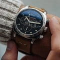 Мужской кварцевый хронографХронографФункция позволяет измерять отрезки времени с особой точностью: часы, минуты, секунды. Верным признаком хронографа является наличие на циферблате 3 дополнительных окошек-счётчиков. с секундомеромСекундомерСекундоме́р — прибор, способный измерять интервалы времени с точностью до долей секунды. и тахиметромТахиметрРазмеченная шкала, располагается на ободке или безеле часов. Тахиметр позволяет рассчитать скорость на определённом участке пути, расстояние измеряется в километрах или милях.. Калибр механизма TMI VK73. Центральные часовая и минутная стрелки, секундная стрелка вынесена на малый циферблат. Большая дата в позиции 12 часов. 12/24х часовой формат времени. Корпус выполнен из нержавеющей стали. Коричневый кожаный ремешок шириной 22 мм, стандартная застежка. Циферблат с люминесцентным покрытиемЛюминесцентное покрытиеПозволяет считывать показания времени в темноте. Производители наносят на стрелки, часовые индексы, безель или поверхность циферблата светонакопительный состав, дающий холодное свечение. стрелок и меток, дополнен выпуклым минеральным стекломМинеральное стеклоМинеральное стекло представляет собой искусственно выращенный минерал кварца. Такое стекло отличается особой устойчивостью к повреждениям и царапинам. Уступает по некоторым качествам сапфировому стеклу. , устойчивым к мелким механическим повреждениям. Водостойкость WR 100 (плавание без погружения).