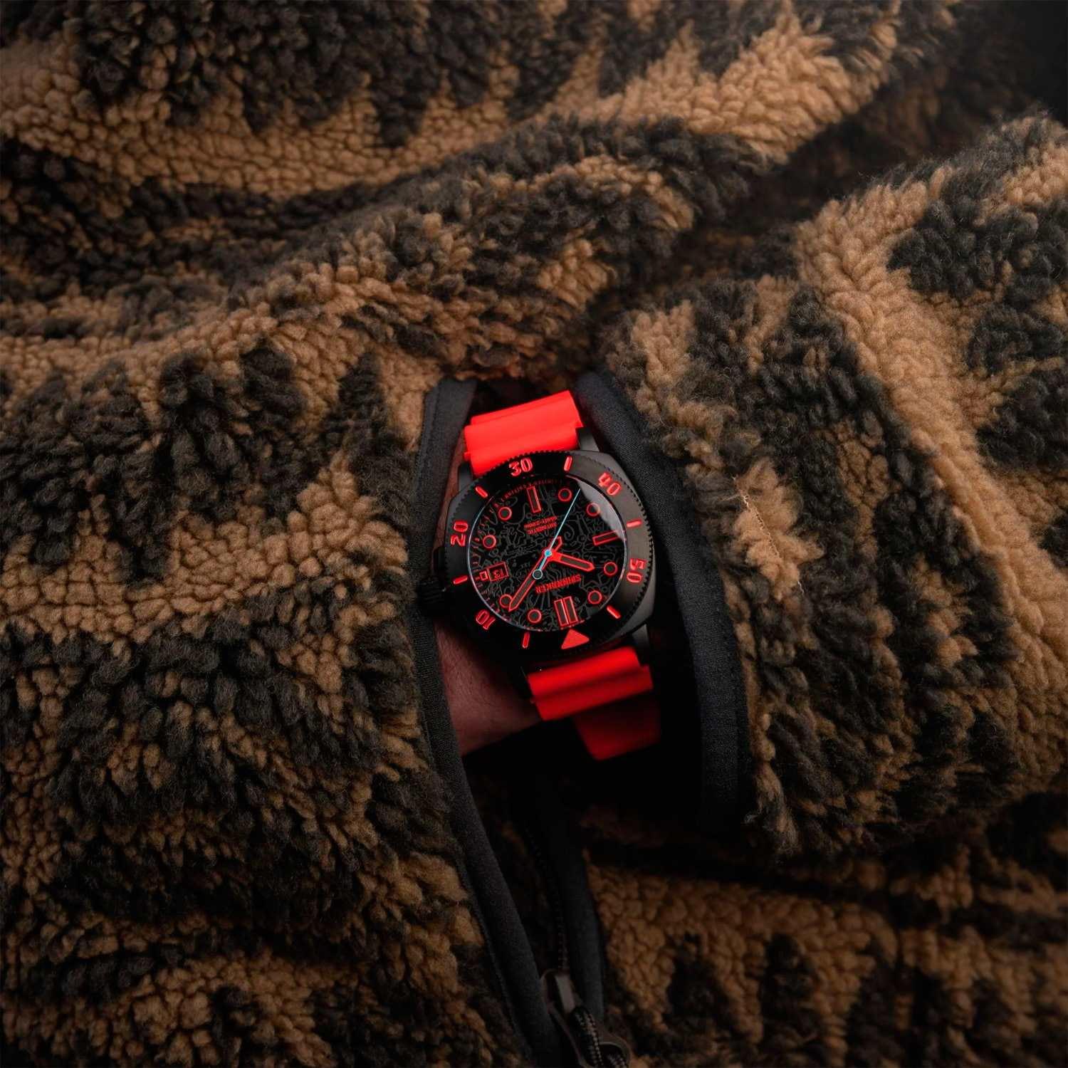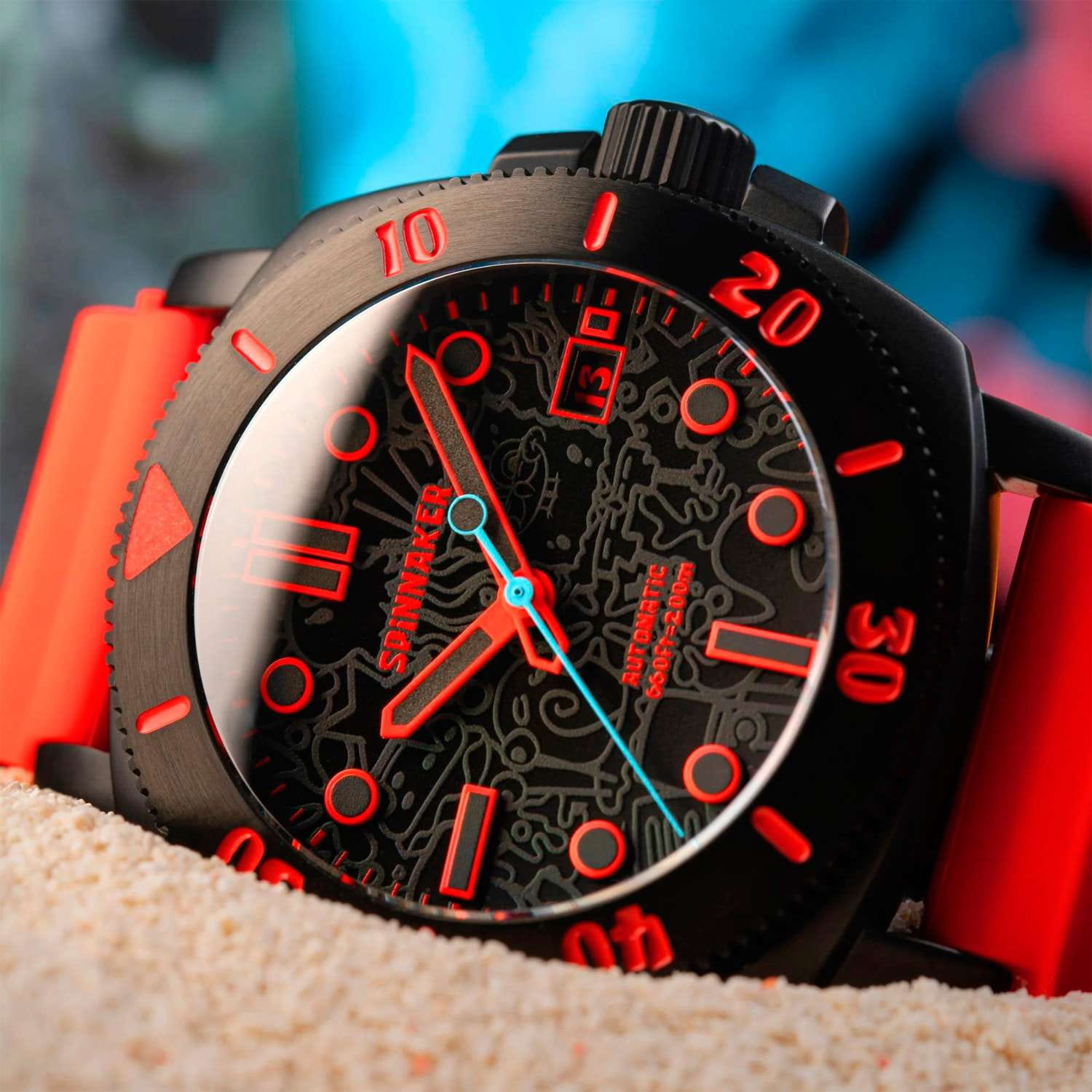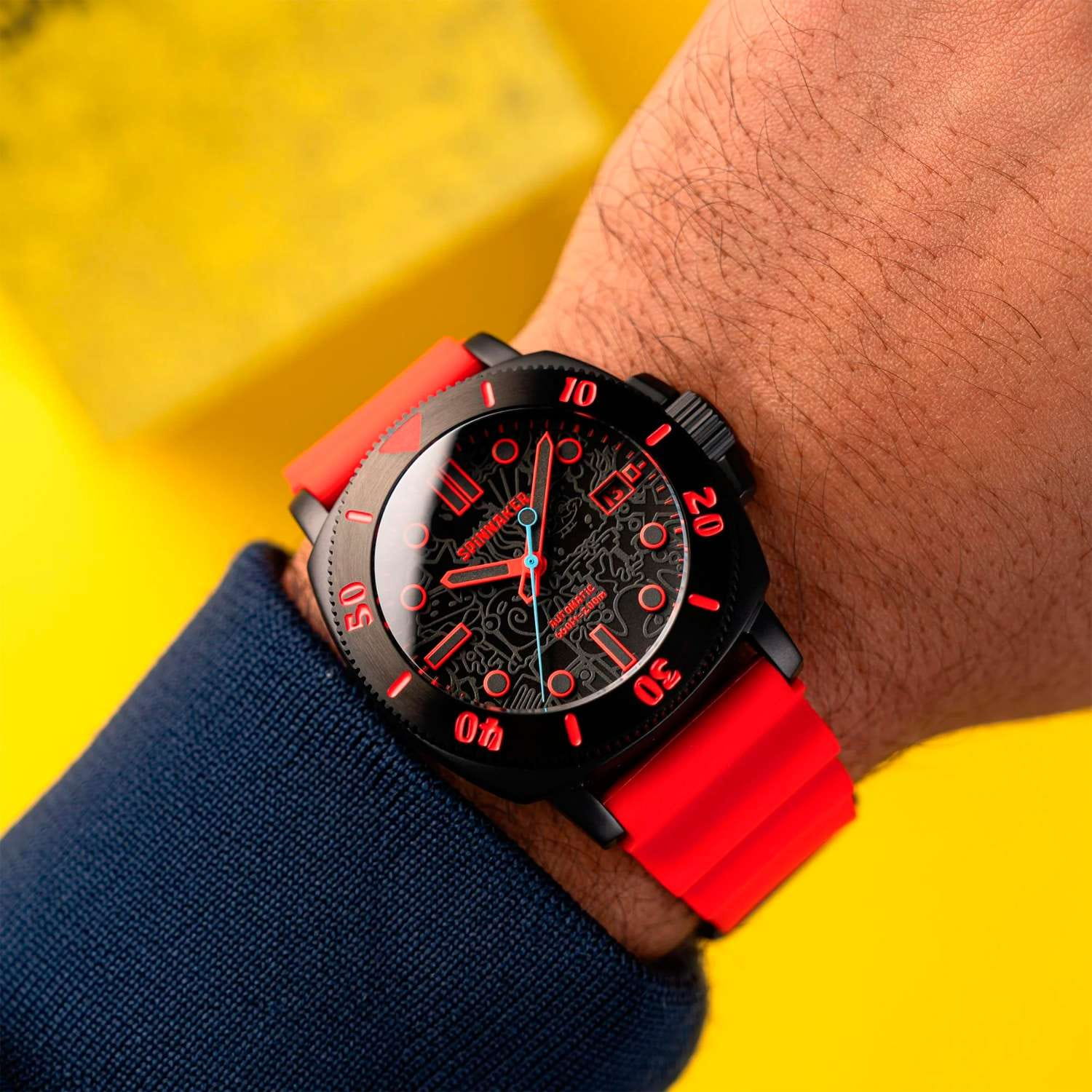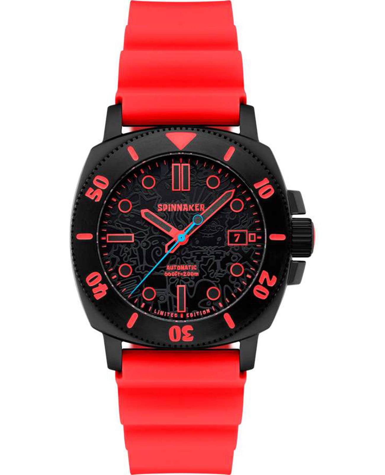 Мужские механические часы с автоподзаводом Spinnaker — это лимитированный и стильный аксессуар. Корпус диаметром 42 мм и толщиной 15 мм выполнен из нержавеющей стали 316L с IP-покрытиемIP-покрытиеМетод ионного напыления. Демонстрирует повышенную устойчивость к истиранию, окислению и химическим веществам. Под воздействием высокого давления и температуры около 1500°C молекулы металла надёжно соединяются с частицами корпуса часов.. Циферблат оформлен штрихами, точками и стрелками. Окошко даты расположено в положении 3 часов. Стрелки и метки с люминесцентным покрытиемЛюминесцентное покрытиеПозволяет считывать показания времени в темноте. Производители наносят на стрелки, часовые индексы, безель или поверхность циферблата светонакопительный состав, дающий холодное свечение., обеспечивающим хорошую читаемость в темноте. На циферблате присутствует скрытый узор, светящийся под УФ-светом. Циферблат защищён сапфировым стекломСапфировое стеклоПрочный и надёжный материал из кристалла сапфира синтетического происхождения, характеризующийся особой твёрдостью и устойчивостью к царапинам и повреждениям. с антибликовым покрытиемАнтибликовое покрытиеСлой оксида металла в 0,13-0,3 микрон, благодаря которому стекло часов не бликует и не отражает свет. Антибликовое покрытие уменьшает отражение света в 10 раз, обеспечивая отличную читаемость показателей циферблата.. Механизм — автоматический калибр Seiko NH35 (24 камня, частота 21 600 полуколебаний в час) с запасом хода более 41 часа. Прозрачная задняя крышка позволяет наблюдать за работой механизма. Часы оснащены красным силиконовым ремешком шириной 22 мм на стандартной пряжке. Водонепроницаемость 200 м позволяет использовать часы для плавания и дайвинга. Идеальный выбор для тех, кто ценит качество и нестандартный дизайн.