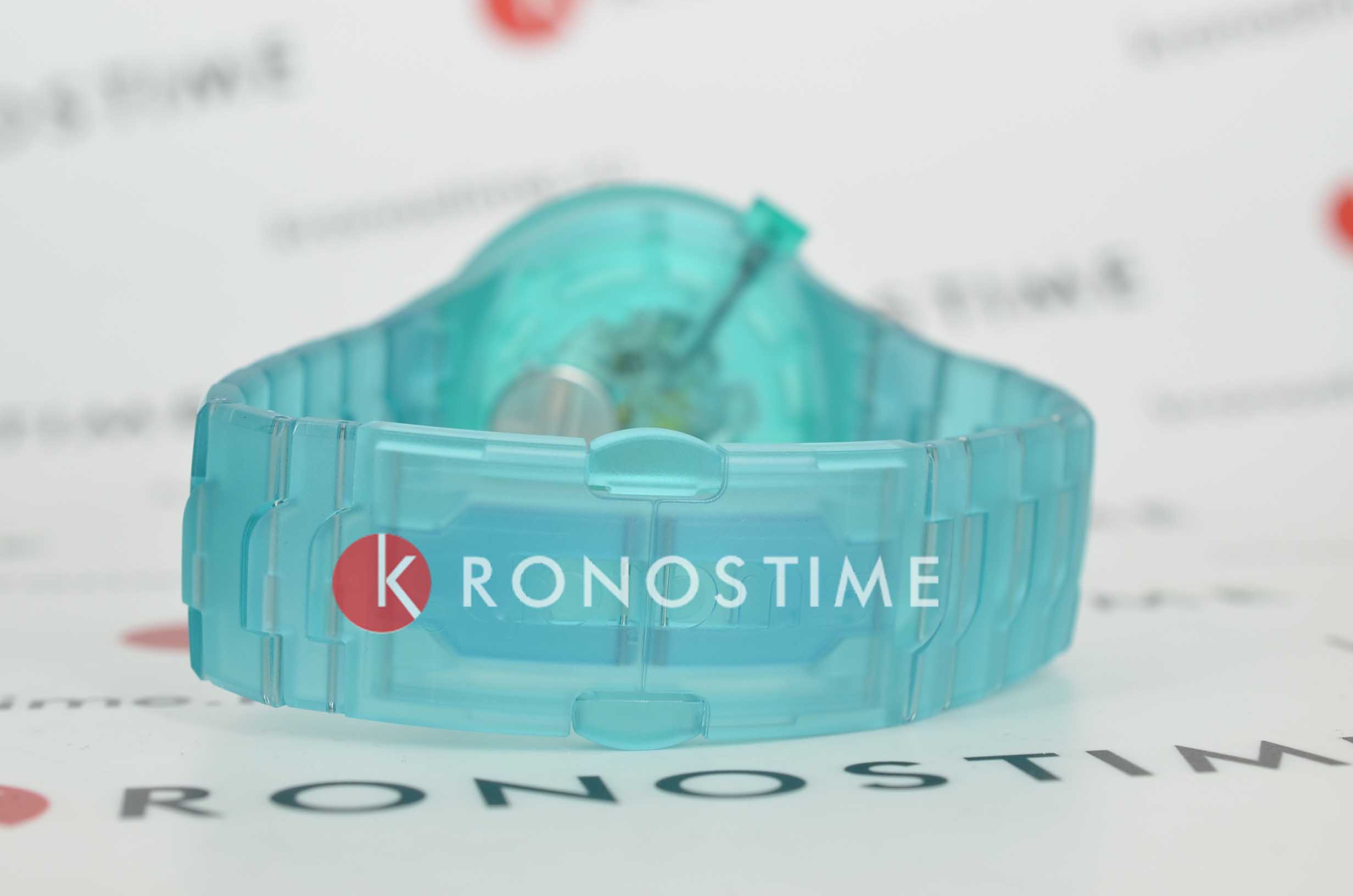 Часы Swatch SB05L101 — это стильный и современный аксессуар для тех, кто ценит лёгкость и комфорт. Часы идеально подойдут как для мужчин, так и для женщин.  Эти большие часы зеленого цвета могут похвастаться прозрачным корпусом и циферблатом зеленого оттенка, изготовленными из биосодержащих материалов, и браслетом с застежкой-бабочкойЗастёжка "бабочка"Такой вид застёжки дополняется предохранителями, помогающими избежать случайного раскрытия браслета. Обладают изящным исполнением. . Прозрачный зеленый циферблат с биологическим покрытием позволяет видеть механизм, а на часовую и минутную стрелки нанесено люминесцентное покрытиеЛюминесцентное покрытиеПозволяет считывать показания времени в темноте. Производители наносят на стрелки, часовые индексы, безель или поверхность циферблата светонакопительный состав, дающий холодное свечение., которое светится в темноте, создавая необычное изображение. Водозащита 30 метров делает часы практичными для повседневного использования. Эти часы подойдут для повседневного ношения и станут ярким акцентом в вашем наряде.