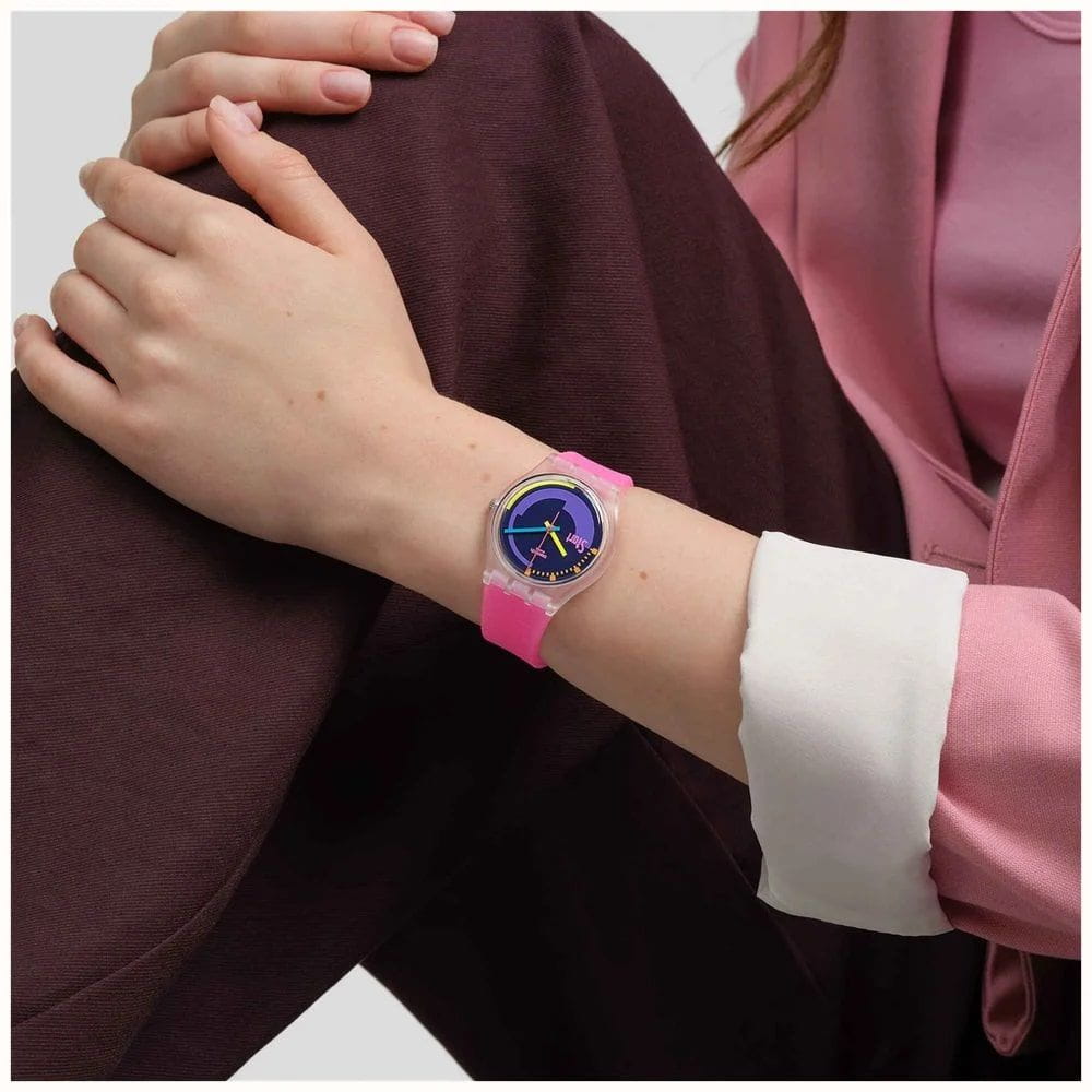Эти ярко окрашенные ретро-часы Swatch SO28K111 вдохновлены часами Swatch из 90-х: SKYCHART GN705. Их многоцветный неоновый циферблат помещен в прозрачный корпус, изготовленный из биоматериала. Ремешок силиконовый ярко-розового цвета и голубая пряжка завершают неоновый образ этих винтажных часов Swatch.