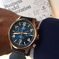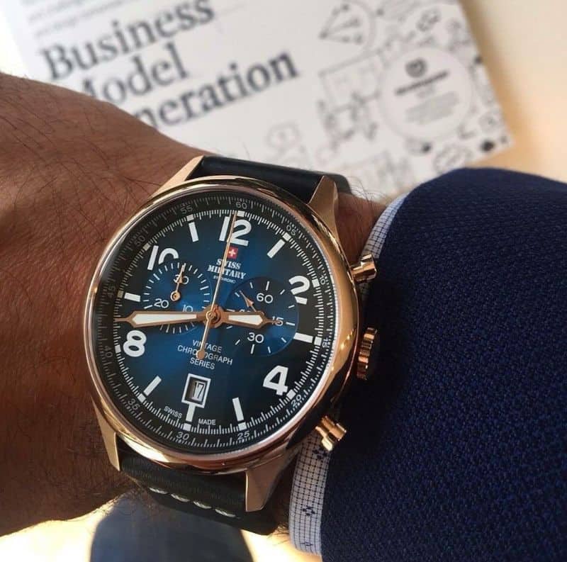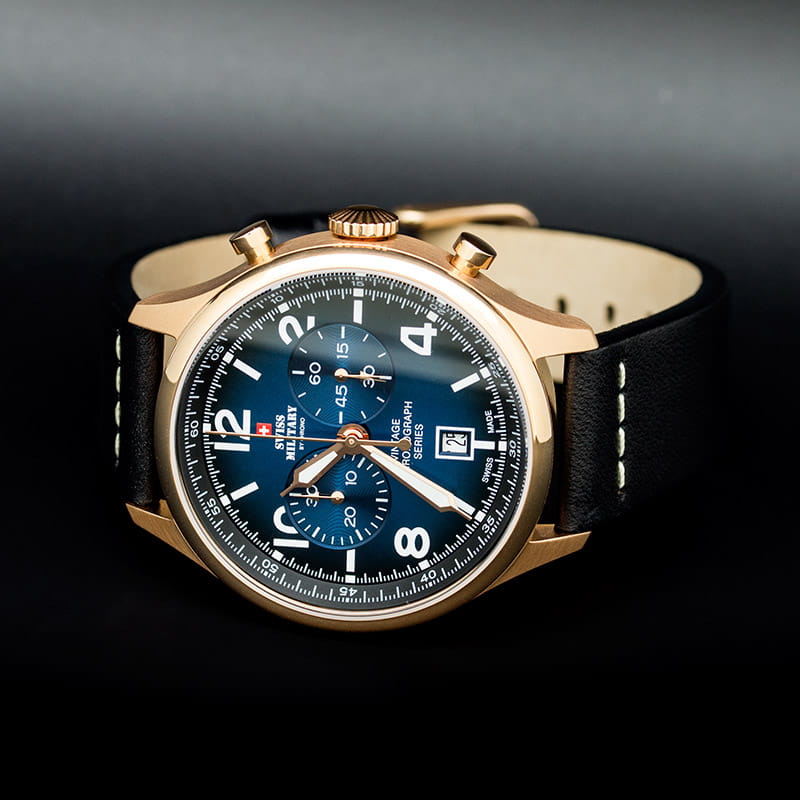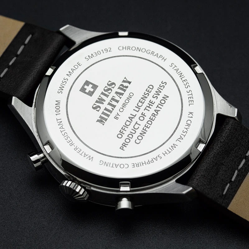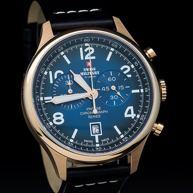 Мужские швейцарские наручные часы-хронографХронографФункция позволяет измерять отрезки времени с особой точностью: часы, минуты, секунды. Верным признаком хронографа является наличие на циферблате 3 дополнительных окошек-счётчиков. с секундомеромСекундомерСекундоме́р — прибор, способный измерять интервалы времени с точностью до долей секунды. Swiss Military by Chrono Minimalist SM30192.06, кварцевый механизм с высокой точностью. Класс водозащиты: 100 метров, позволит плавать, нырять и заниматься другими водными видами спорта. Корпус часов изготовлен из стали с PVDPVDУльтратонкое покрытие наносится в технике вакуумного напыления, сочетает в себе нитрид титана особой прочности со слоем золота или оксида хрома. Несёт в себе декоративную или защитную функцию. покрытием золотистого цвета. Люминесцентная подсветкаЛюминесцентное покрытиеПозволяет считывать показания времени в темноте. Производители наносят на стрелки, часовые индексы, безель или поверхность циферблата светонакопительный состав, дающий холодное свечение. на стрелках и метках. Кожаный ремешок с классической застежкой.
