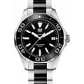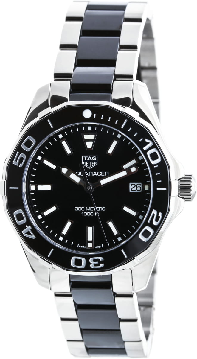 TAG Heuer Aquaracer WAY131A.BA0913 — элегантные женские часы, сочетающие стиль и функциональность. Корпус диаметром 35 мм и толщиной 10,75 мм выполнен из полированной нержавеющей стали, обеспечивая долговечность и устойчивость к коррозии. Чёрный лакированный циферблат оснащён накладными часовыми метками и стрелками с люминесцентным покрытиемЛюминесцентное покрытиеПозволяет считывать показания времени в темноте. Производители наносят на стрелки, часовые индексы, безель или поверхность циферблата светонакопительный состав, дающий холодное свечение., обеспечивающим отличную читаемость в любых условиях освещения. Его поверхность защищена сапфировым стекломСапфировое стеклоПрочный и надёжный материал из кристалла сапфира синтетического происхождения, характеризующийся особой твёрдостью и устойчивостью к царапинам и повреждениям., устойчивым к царапинам. Часы оснащены точным кварцевым механизмом, обеспечивающим стабильное отображение времени. Функциональность включает индикацию часов, минут, секунд и даты, расположенной на отметке «3 часа». БезельБезельВнешний ободок, закрепляющий стекло. В спортивных часах так называется поворотное кольцо с делениями на циферблате, выполняет роль таймера – замеряет отрезки времени на шкале. Неподвижный безель – элемент декора. Однонаправленно вращающийся безель на дайверских часах позволяет фиксировать моменты погружения и выныривания на поверхность. однонаправленный вращающийся, выполнен из стали и чёрной керамики, устойчивой к царапинам. Водозащита до 300 метров (30 бар) делает модель подходящей для дайвинга и активного образа жизни. Браслет комбинированный, выполнен из полированной нержавеющей стали и чёрной керамики, оснащён застёжкой-бабочкой с кнопкамиЗастёжка "бабочка"Такой вид застёжки дополняется предохранителями, помогающими избежать случайного раскрытия браслета. Обладают изящным исполнением. .с кнопками для дополнительной безопасности.