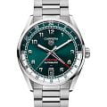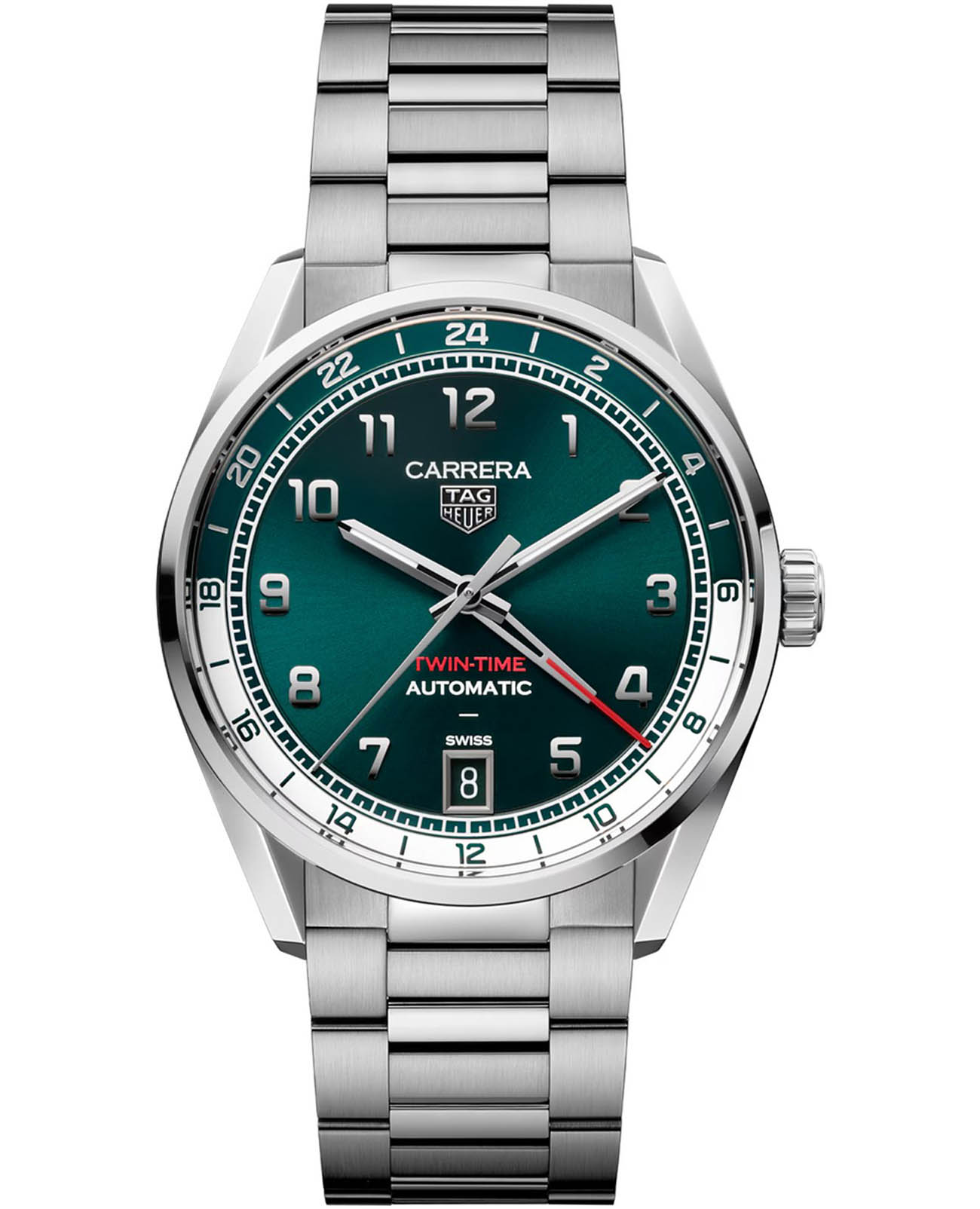 Утончённые часы TAG Heuer Carrera Date Twin-Time WDA2114.BA0043 созданы для стильных и смелых мужчин. Механический механизм (автоматический калибр) с высокой точностью производится целиком в стенах компании. Стальной корпус с диаметром 41 мм. Окно даты в положении «6 часов» органично вписывается в изысканный дизайн циферблата, а стальной корпус 41 мм и браслет обеспечивают универсальность модели. Сапфировое стеклоСапфировое стеклоПрочный и надёжный материал из кристалла сапфира синтетического происхождения, характеризующийся особой твёрдостью и устойчивостью к царапинам и повреждениям. с антибликовым покрытием, устойчивое к появлению царапин, обладающее высокой прозрачностью. Бирюзово-зеленый циферблат с эффектом солнечных лучей создает яркий, мгновенно узнаваемый образ. На стрелки нанесено люминесцентное покрытиеЛюминесцентное покрытиеПозволяет считывать показания времени в темноте. Производители наносят на стрелки, часовые индексы, безель или поверхность циферблата светонакопительный состав, дающий холодное свечение.. Класс водозащиты: 100 метров, позволит плавать, нырять и заниматься другими водными видами спорта. Браслет с раскладной застёжкойРаскладная застёжкаТакой тип застёжки используется только на браслетах из металла. Она никогда не раскрывается полностью, происходит разделение на 2 и более частей. Раскладывающая застёжка снизит вероятность потери часов к минимуму.. Часы с автоматическим механизмом имеют обновленный, более эргономичный дизайн корпуса и браслета. Данная модель отличается фирменными цифровыми индексами и характерной формой стрелки GMT.