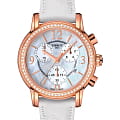 Перламутровый циферблат идеально подходит к белому кожаному ремешку, имеющему оригинальную деталь - цветочный рисунок. Стальной корпус имеет PVD-покрытиеPVDУльтратонкое покрытие наносится в технике вакуумного напыления, сочетает в себе нитрид титана особой прочности со слоем золота или оксида хрома. Несёт в себе декоративную или защитную функцию. оттенка «розовое золото», но главную особенность представляет безельБезельВнешний ободок, закрепляющий стекло. В спортивных часах так называется поворотное кольцо с делениями на циферблате, выполняет роль таймера – замеряет отрезки времени на шкале. Неподвижный безель – элемент декора. Однонаправленно вращающийся безель на дайверских часах позволяет фиксировать моменты погружения и выныривания на поверхность., декорированный по всей окружности 66 бриллиантами. Наручные часы работают за счёт кварцевого калибра ETA G15.211 с высокой точностью хода. Надёжное сапфировое стекло. ХронографХронографФункция позволяет измерять отрезки времени с особой точностью: часы, минуты, секунды. Верным признаком хронографа является наличие на циферблате 3 дополнительных окошек-счётчиков., секундомер, индикация числа. . Габариты: 35 x 35 x 10 мм.