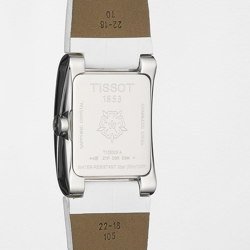 TISSOT T1053091601800 - женские кварцевые наручные часы Корпус этих часов небольшого размера (27,5 мм) и выполнен из нержавеющей стали L316 Модель T1053091601800 имеет устойчивое к царапинам сапфировое стекло,кожаный ремешок, белый циферблат Калибр механизма: ETA F03111 Класс водозащиты: 30 м / 3 АТМ  Дополнительные функции и особенности: отображение даты Полная заводская комплектация TISSOT: оригинальные часы, фирменная коробка, инструкция, сервисная книжка, роман о часовой фабрике, миникаталог, замшевый фирменный чехол черного цвета для хранения и/или переноски часов, кассовый и товарный чеки Международная гарантия 2 года Производство и сборка: Швейцария