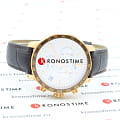 Внушительный корпус 42 мм имеет PVD-покрытиеPVDУльтратонкое покрытие наносится в технике вакуумного напыления, сочетает в себе нитрид титана особой прочности со слоем золота или оксида хрома. Несёт в себе декоративную или защитную функцию. цвета розового золота, модель сочетает в себе классические и спортивные элементы. Золотистые метки и стрелки чётко выделяются на белом фоне циферблата с миниатюрными счётчиками хронографаХронографФункция позволяет измерять отрезки времени с особой точностью: часы, минуты, секунды. Верным признаком хронографа является наличие на циферблате 3 дополнительных окошек-счётчиков.. Часы оснащены кварцевым калибром ETA G10.211 с высокой точностью хода. Сапфировое стекло. Водонепроницаемость 100 метров. Секундомер, тахиметрическая шкалаТахиметрРазмеченная шкала, располагается на ободке или безеле часов. Тахиметр позволяет рассчитать скорость на определённом участке пути, расстояние измеряется в километрах или милях., окошко даты. Габариты: 42 x 42 x 10,7 мм.