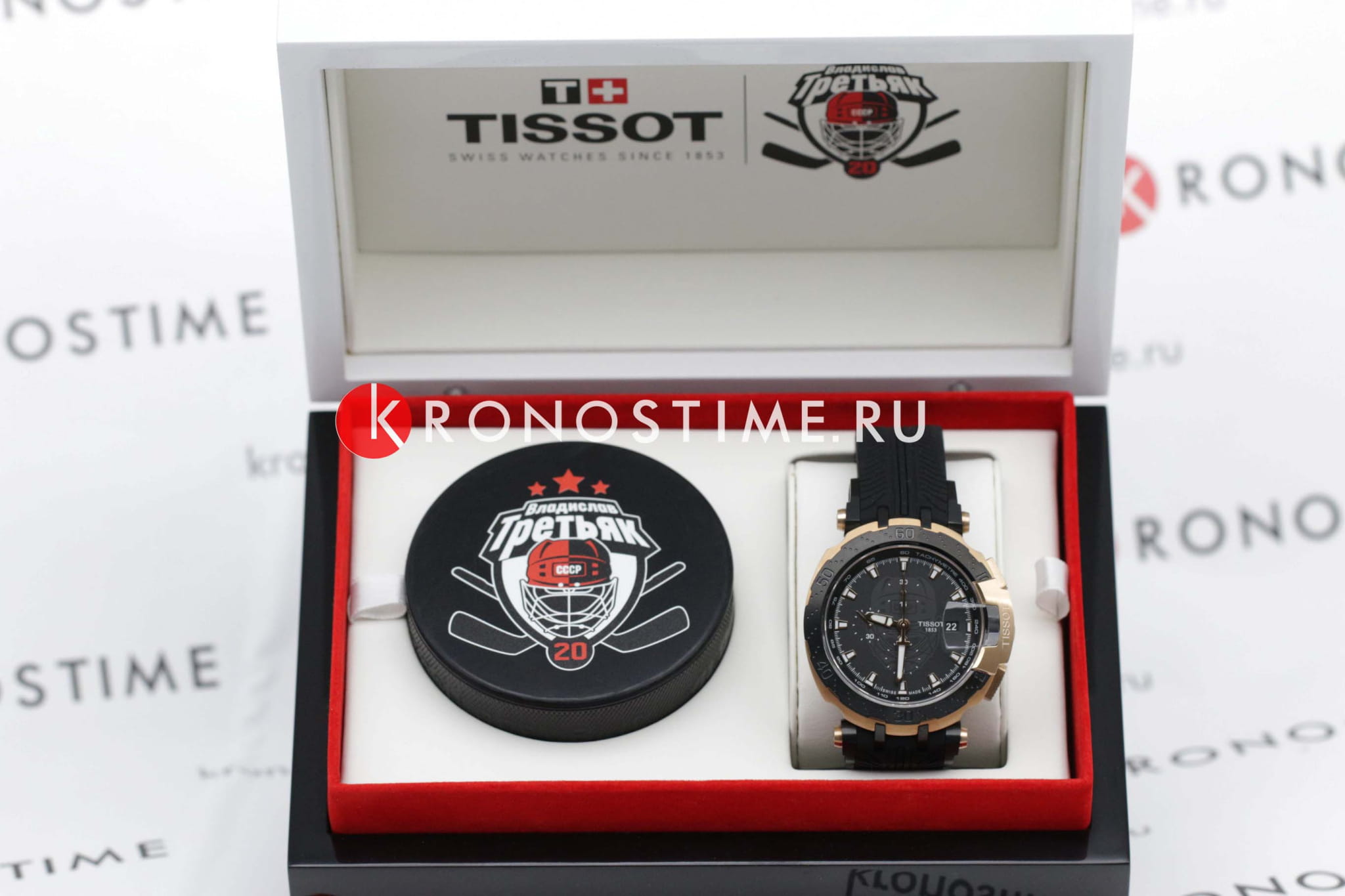 Мужские лимитированные швейцарские механические часы (20 экземпляров на Россию) из коллекции T-Race выпущены в честь легендарного хоккеиста Владислава Третьяка. (Владислав Третьяк — единственный хоккеист, которому удалось три раза получить награду лучшему хоккеисту Европы — «Золотую клюшку». Третьяк завоевал в общей сложности 90 медалей, в числе которых 3 золотые олимпийские, 10 золотых медалей чемпиона мира, 12 золотых — чемпиона Европы.) Часы с автоподзаводом, они оснащены популярным калибром ETA C01.211 с запасом хода 45 часов. Стальной корпус с чёрным и розово-золотистым PVDPVDУльтратонкое покрытие наносится в технике вакуумного напыления, сочетает в себе нитрид титана особой прочности со слоем золота или оксида хрома. Несёт в себе декоративную или защитную функцию.-покрытием. Сапфировое стеклоСапфировое стеклоПрочный и надёжный материал из кристалла сапфира синтетического происхождения, характеризующийся особой твёрдостью и устойчивостью к царапинам и повреждениям.. Удобный силиконовый браслет с раскладной застёжкойРаскладная застёжкаТакой тип застёжки используется только на браслетах из металла. Она никогда не раскрывается полностью, происходит разделение на 2 и более частей. Раскладывающая застёжка снизит вероятность потери часов к минимуму.. Люминесцентное покрытиеЛюминесцентное покрытиеПозволяет считывать показания времени в темноте. Производители наносят на стрелки, часовые индексы, безель или поверхность циферблата светонакопительный состав, дающий холодное свечение.. Водостойкость до 10 бар. СекундомерСекундомерСекундоме́р — прибор, способный измерять интервалы времени с точностью до долей секунды., тахиметрТахиметрРазмеченная шкала, располагается на ободке или безеле часов. Тахиметр позволяет рассчитать скорость на определённом участке пути, расстояние измеряется в километрах или милях., индикация числа. Габариты: 47,25 x 45 x 16 мм. Производство и сборка: Швейцария.