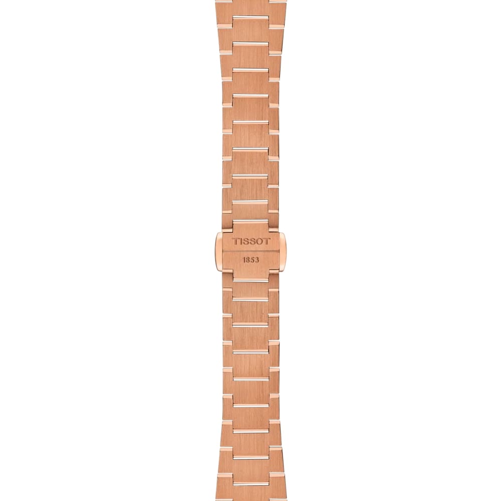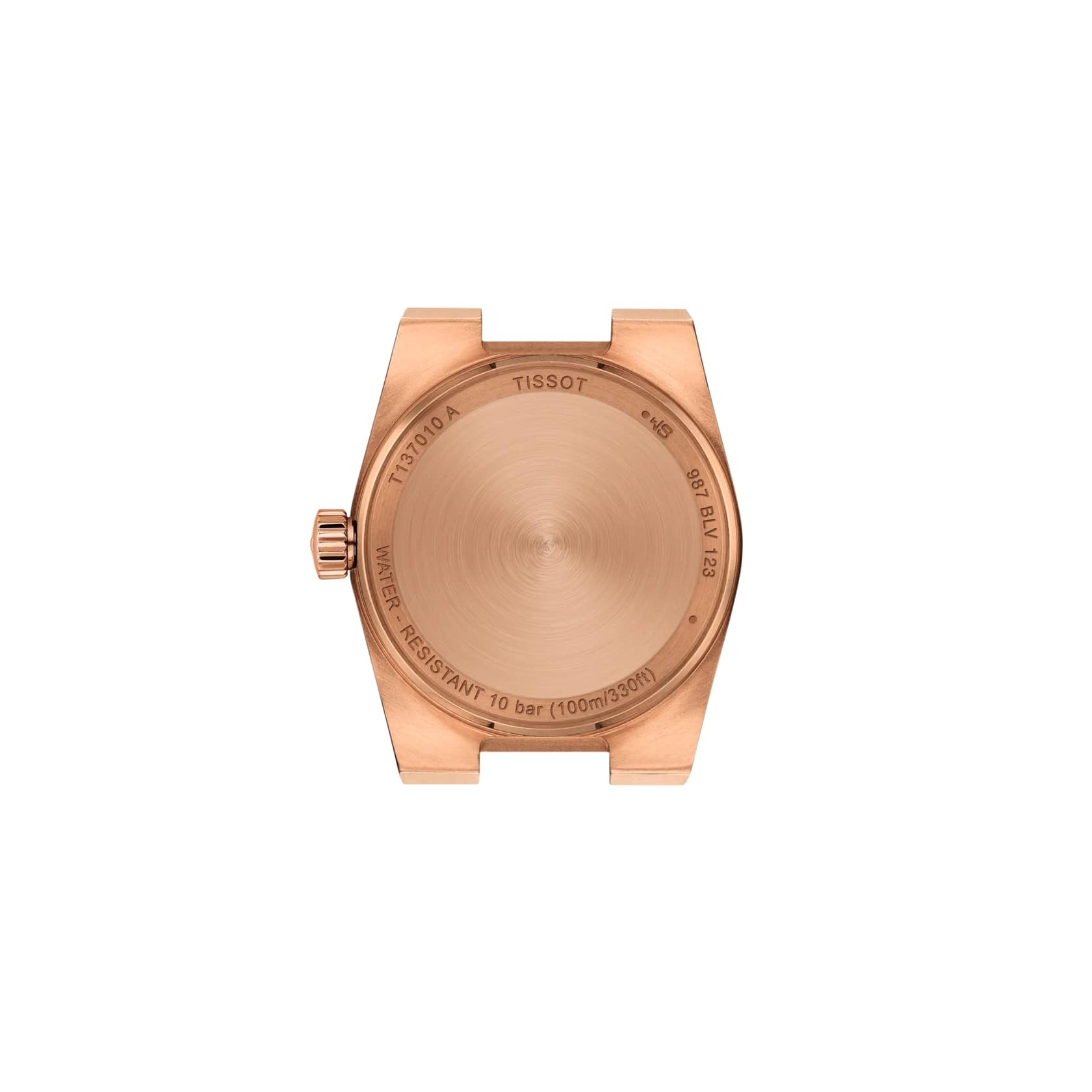 Часы Tissot PRX 25 мм T137.010.33.506.00 сочетают винтажный стиль 70-х годов с современными технологиями. Корпус диаметром 25 мм выполнен из нержавеющей стали 316L с покрытием PVDPVDУльтратонкое покрытие наносится в технике вакуумного напыления, сочетает в себе нитрид титана особой прочности со слоем золота или оксида хрома. Несёт в себе декоративную или защитную функцию. цвета розового золота, придающим часам элегантный вид. Розовый циферблат украшен 36 бриллиантами общим весом 0,4 карата, что добавляет изысканности. Циферблат защищён сапфировым стекломСапфировое стеклоПрочный и надёжный материал из кристалла сапфира синтетического происхождения, характеризующийся особой твёрдостью и устойчивостью к царапинам и повреждениям. с антибликовым покрытием, обеспечивающим стойкость к царапинам и отличную читаемость.
