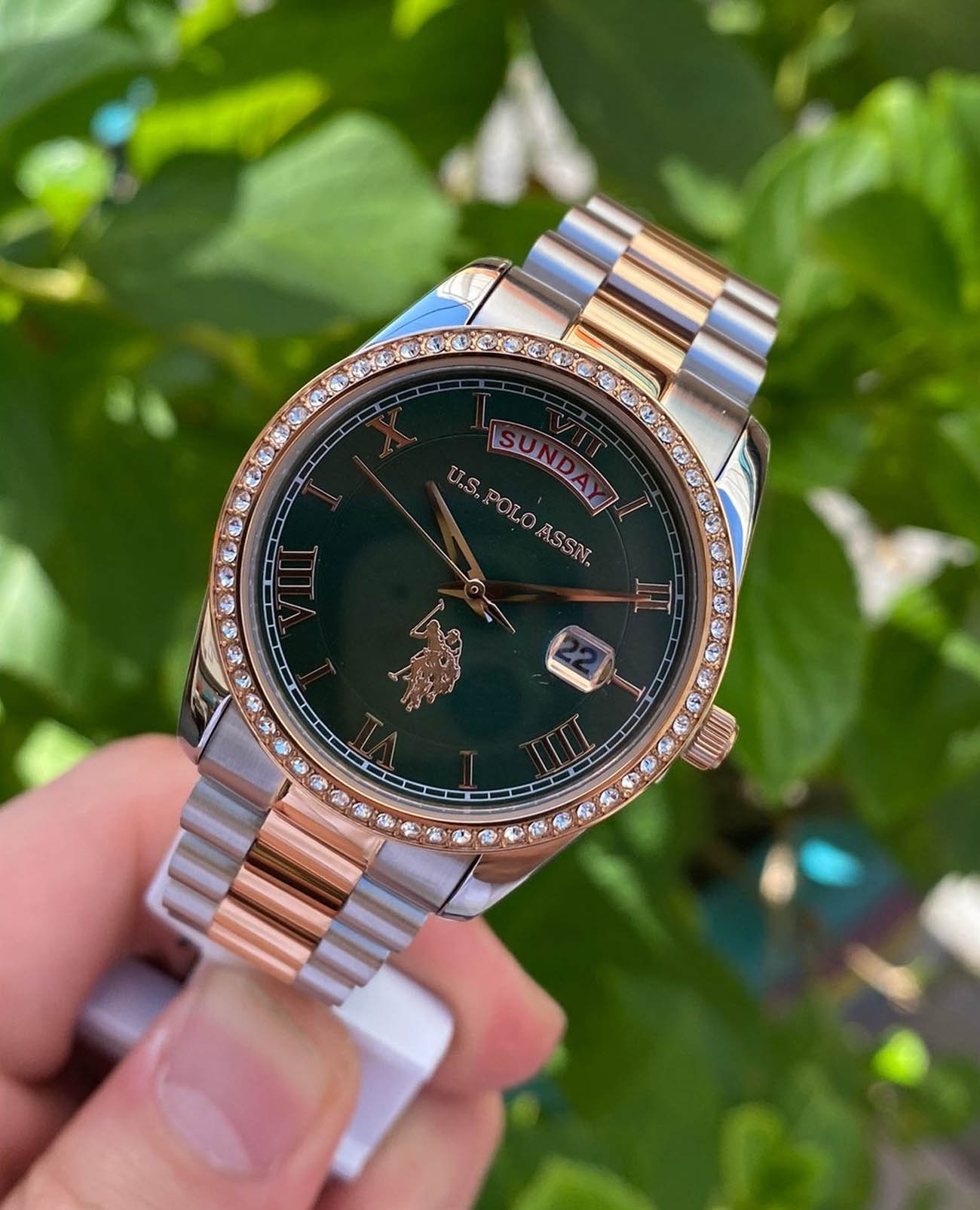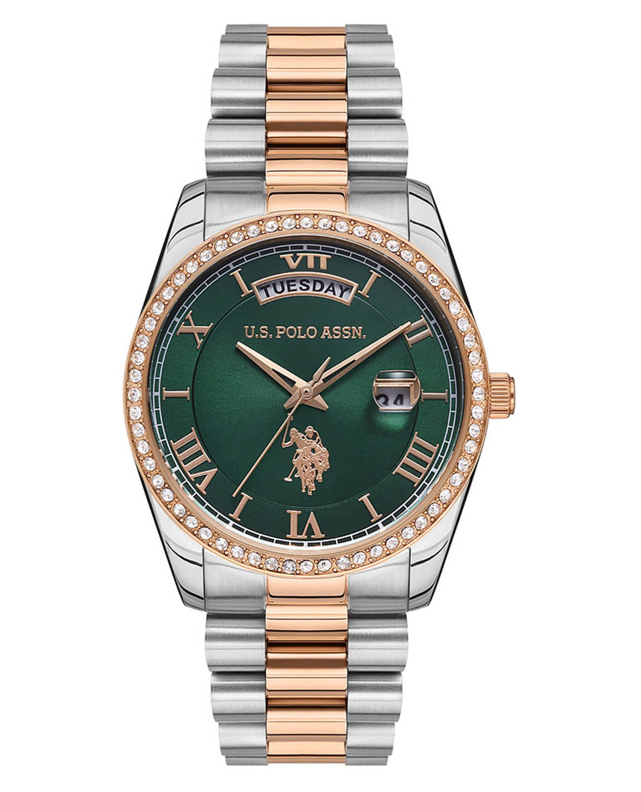 Женские часы U.S. Polo Assn. Stile USPA2054-05, кварцевый механизм с высокой точностью. Минеральное стеклоМинеральное стеклоМинеральное стекло представляет собой искусственно выращенный минерал кварца. Такое стекло отличается особой устойчивостью к повреждениям и царапинам. Уступает по некоторым качествам сапфировому стеклу. устойчивое к появлению царапин, обладающее высокой прозрачностью. Корпус изготовлен из нержавеющей стали. БезельБезельВнешний ободок, закрепляющий стекло. В спортивных часах так называется поворотное кольцо с делениями на циферблате, выполняет роль таймера – замеряет отрезки времени на шкале. Неподвижный безель – элемент декора. Однонаправленно вращающийся безель на дайверских часах позволяет фиксировать моменты погружения и выныривания на поверхность. из нержавеющей стали с IP-покрытиемIP-покрытиеМетод ионного напыления. Демонстрирует повышенную устойчивость к истиранию, окислению и химическим веществам. Под воздействием высокого давления и температуры около 1500°C молекулы металла надёжно соединяются с частицами корпуса часов. и украшен кристаллами. Окошко даты в положении 3 часов, окошко дня недели в положении 12 часов. Класс водозащиты: 30 метров, позволит защитить корпус от случайных брызг или капель дождя. Стальной браслет с частичным IP-покрытиемIP-покрытиеМетод ионного напыления. Демонстрирует повышенную устойчивость к истиранию, окислению и химическим веществам. Под воздействием высокого давления и температуры около 1500°C молекулы металла надёжно соединяются с частицами корпуса часов. на застёжке «бабочка» с кнопкамиЗастёжка "бабочка"Такой вид застёжки дополняется предохранителями, помогающими избежать случайного раскрытия браслета. Обладают изящным исполнением. .
