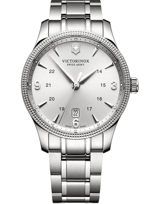 Мужские швейцарские часы Victorinox Alliance 241712.1, кварцевый механизм с высокой точностью. Сапфировое стеклоСапфировое стеклоПрочный и надёжный материал из кристалла сапфира синтетического происхождения, характеризующийся особой твёрдостью и устойчивостью к царапинам и повреждениям. устойчивое к появлению царапин, обладающее высокой прозрачностью. Класс водозащиты: 100 метров, позволит плавать, нырять и заниматься другими водными видами спорта. Корпус часов изготовлен из нержавеющей стали 316L. Стрелки с люминесцентным покрытиемЛюминесцентное покрытиеПозволяет считывать показания времени в темноте. Производители наносят на стрелки, часовые индексы, безель или поверхность циферблата светонакопительный состав, дающий холодное свечение..