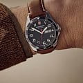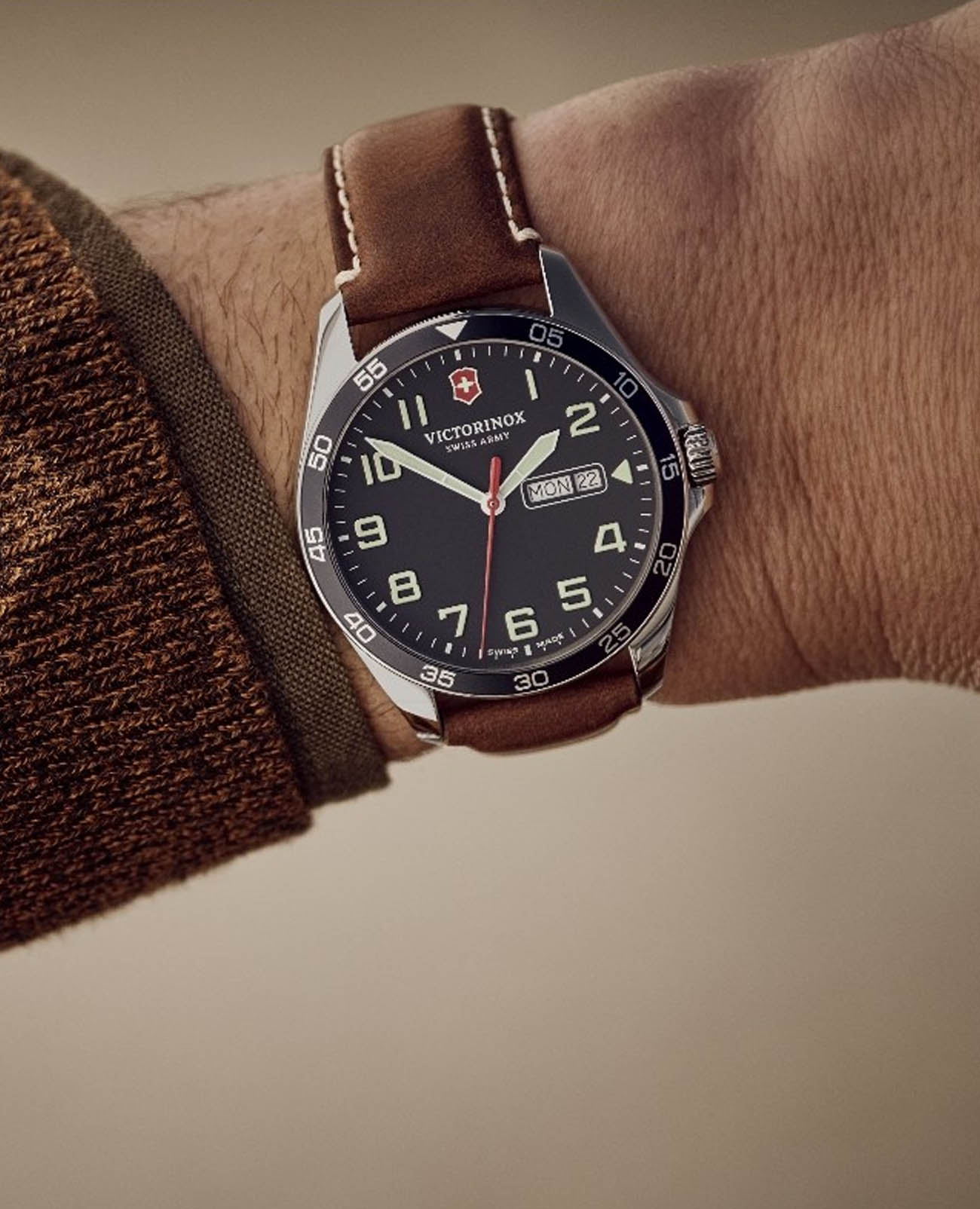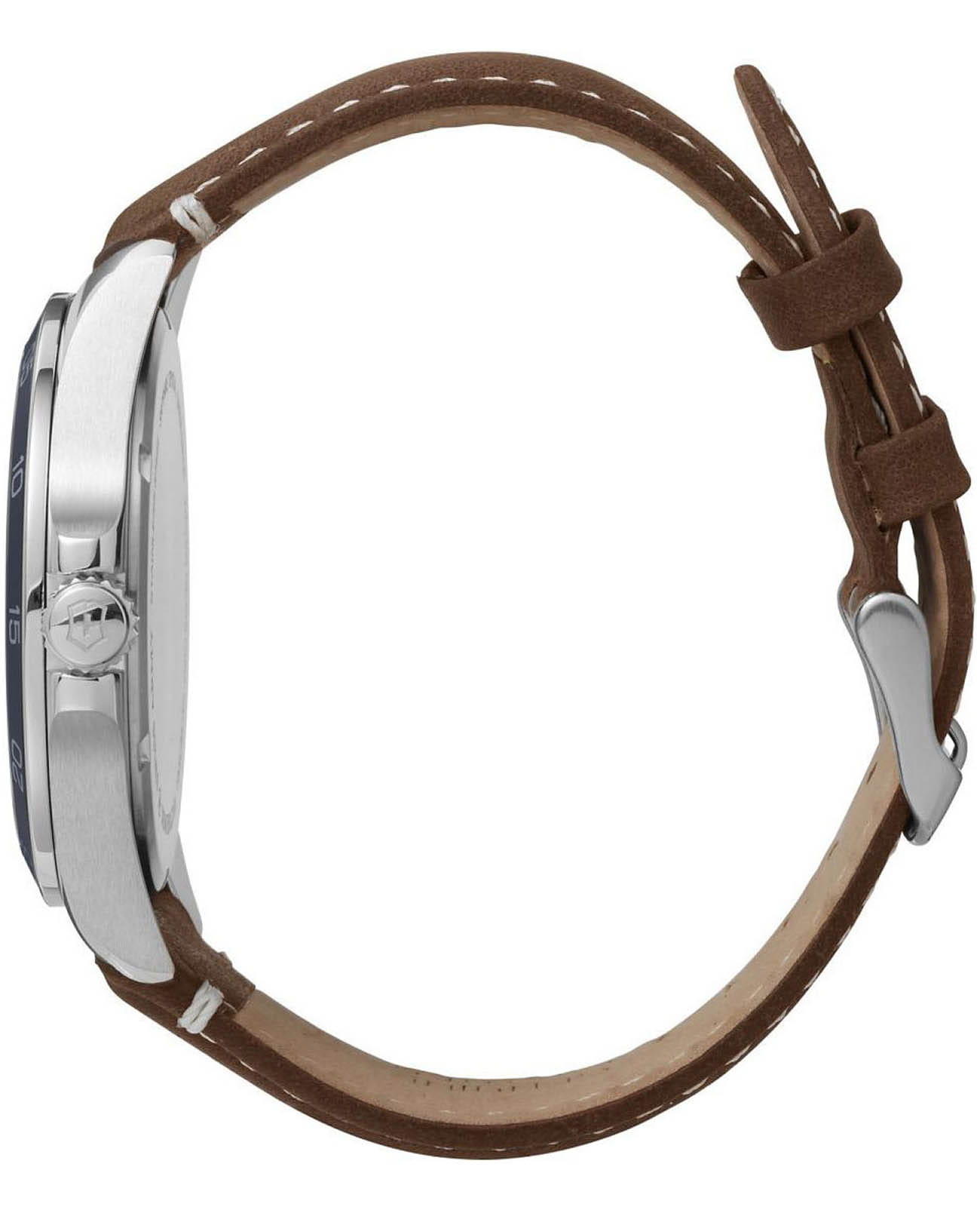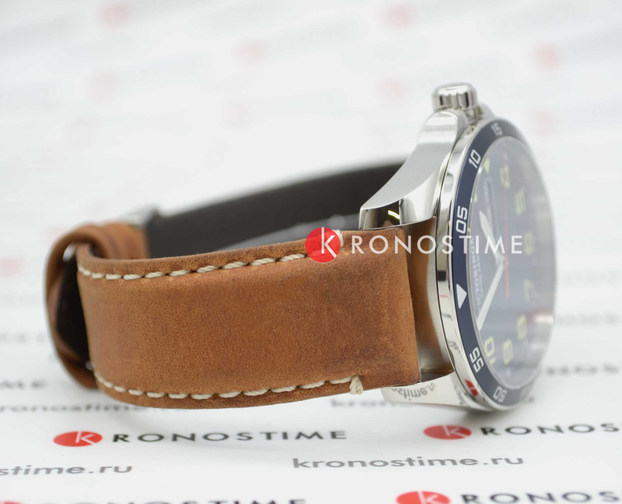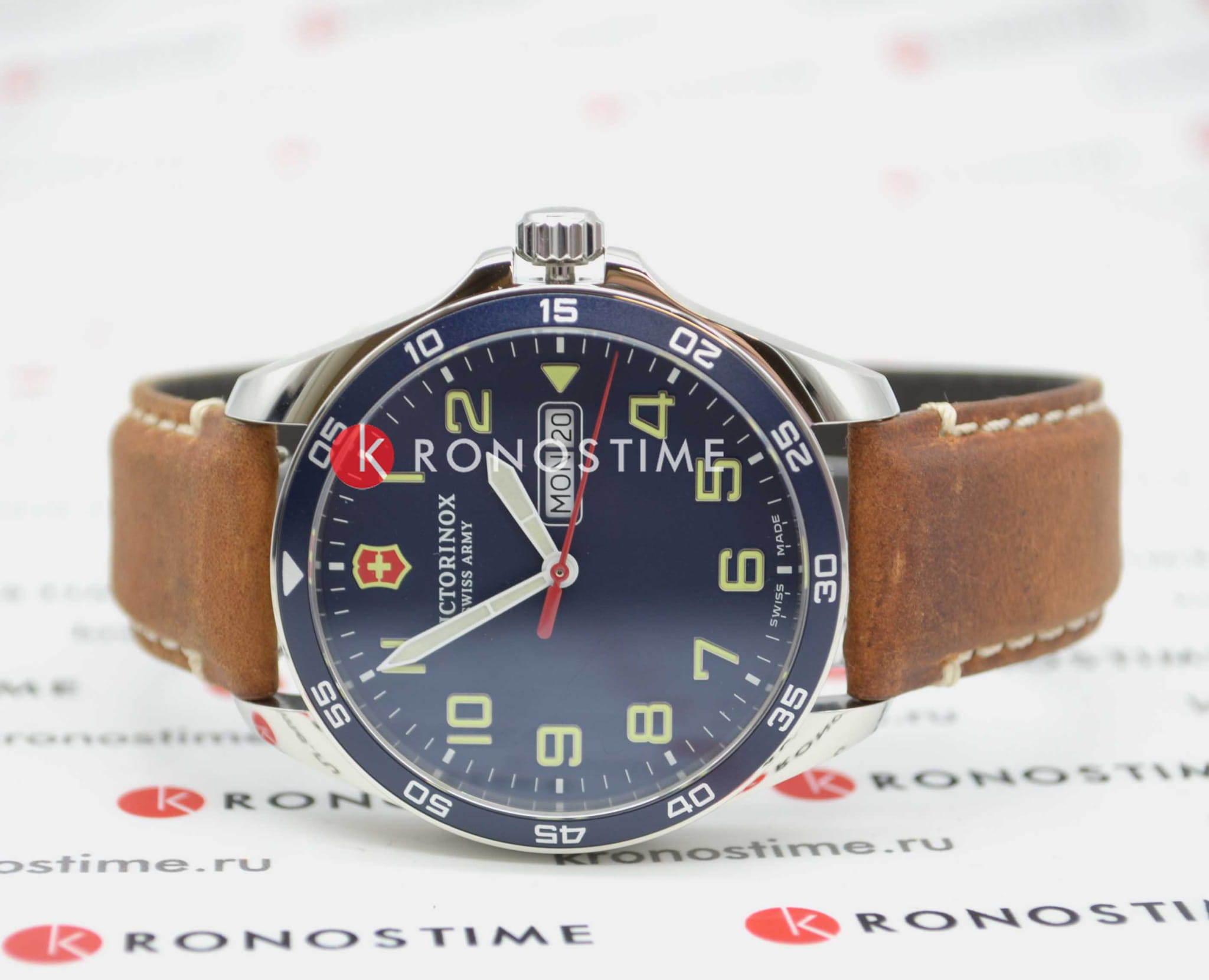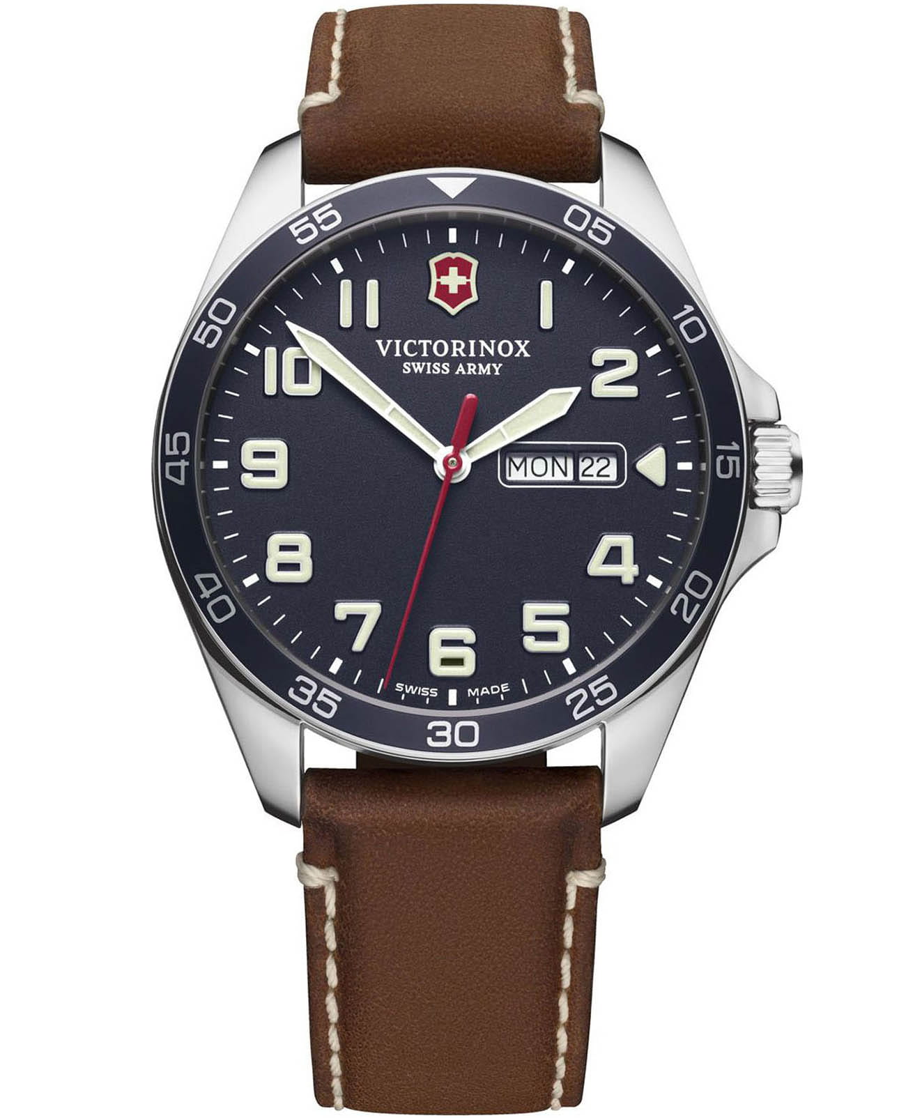 Мужские швейцарские часы Victorinox Fieldforce 241848 с надёжным кварцевым механизмом. Сапфировое стеклоСапфировое стеклоПрочный и надёжный материал из кристалла сапфира синтетического происхождения, характеризующийся особой твёрдостью и устойчивостью к царапинам и повреждениям. с трёхслойным антибликовым покрытием. Корпус часов выполнен из нержавеющей стали 316L. Практичный кожаный ремешок на стандартной застёжке. Влагозащита: 100 метров, позволит плавать, нырять и заниматься другими водными видами спорта. Окошко даты и дня недели находится в положении 3 часа. Стрелки и метки с люминесцентным покрытиемЛюминесцентное покрытиеПозволяет считывать показания времени в темноте. Производители наносят на стрелки, часовые индексы, безель или поверхность циферблата светонакопительный состав, дающий холодное свечение..