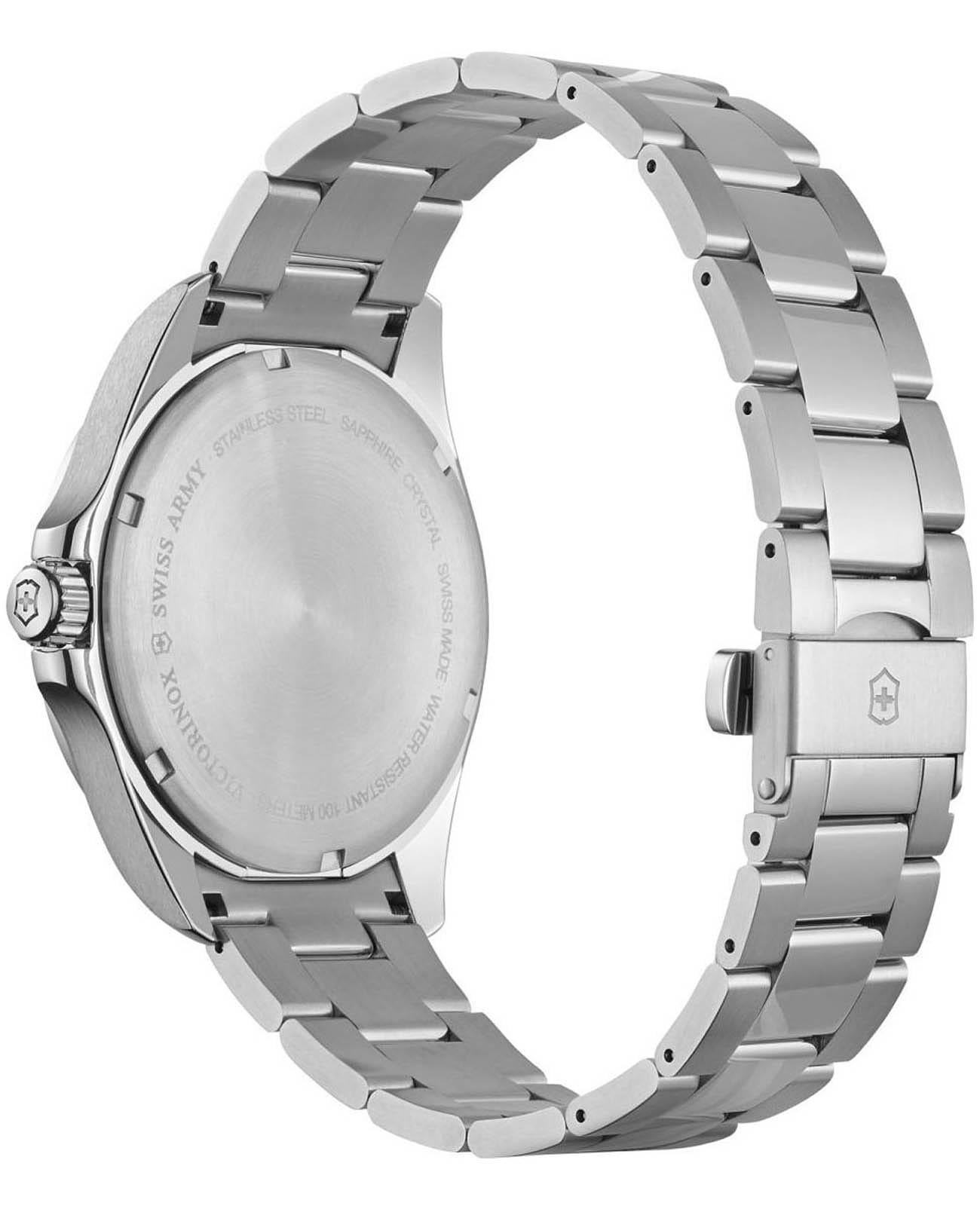 Мужские швейцарские часы Victorinox Fieldforce 241849 с надёжным кварцевым механизмом. Сапфировое стеклоСапфировое стеклоПрочный и надёжный материал из кристалла сапфира синтетического происхождения, характеризующийся особой твёрдостью и устойчивостью к царапинам и повреждениям. с трёхслойным антибликовым покрытием. Корпус часов выполнен из нержавеющей стали 316L. Стальной браслет на раскладной застёжкеРаскладная застёжкаТакой тип застёжки используется только на браслетах из металла. Она никогда не раскрывается полностью, происходит разделение на 2 и более частей. Раскладывающая застёжка снизит вероятность потери часов к минимуму.. Влагозащита: 100 метров, позволит плавать, нырять и заниматься другими водными видами спорта. Окошко даты и дня недели находится в положении 3 часа. Стрелки и метки с люминесцентным покрытиемЛюминесцентное покрытиеПозволяет считывать показания времени в темноте. Производители наносят на стрелки, часовые индексы, безель или поверхность циферблата светонакопительный состав, дающий холодное свечение..