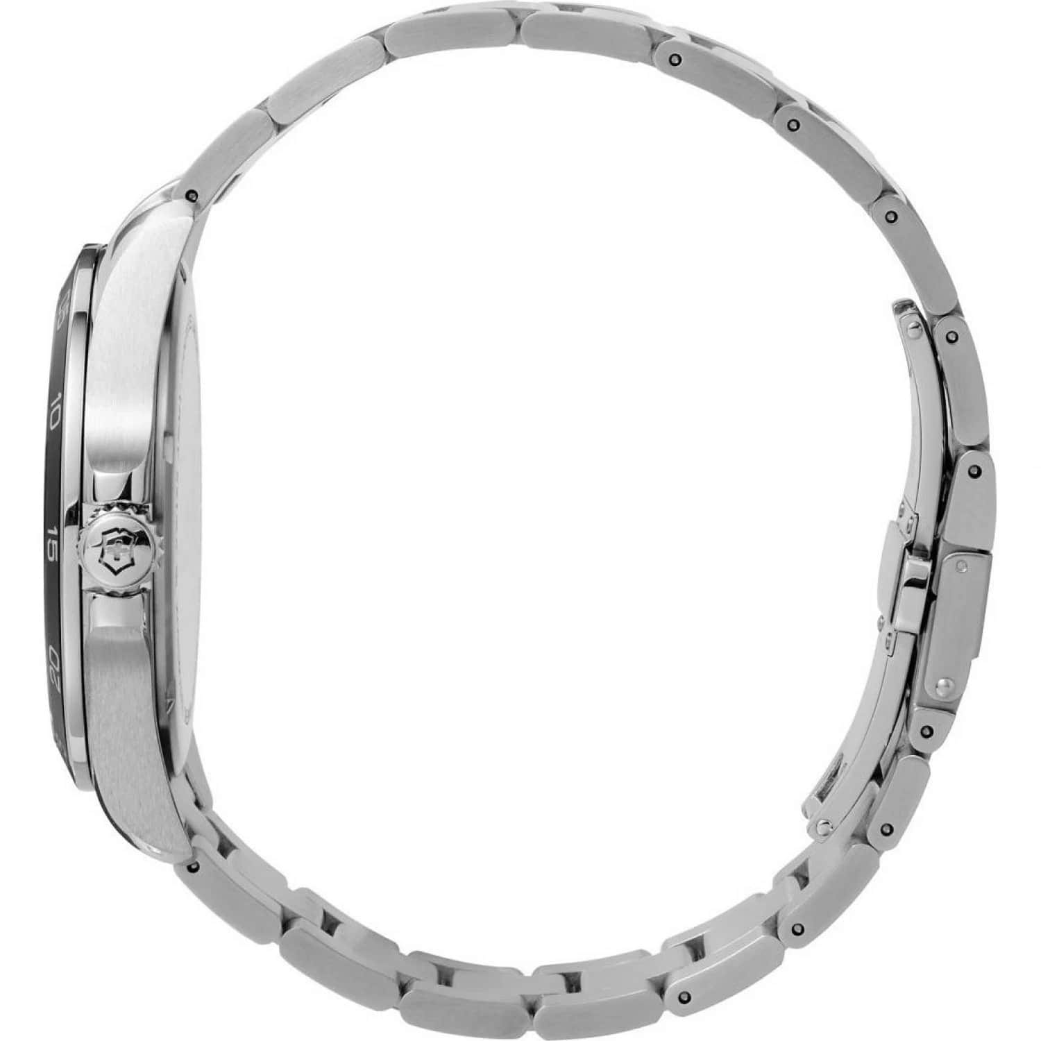 Мужские наручные часы Victorinox 241850 с надежным кварцевым механизмом. Сапфировое стеклоСапфировое стеклоПрочный и надёжный материал из кристалла сапфира синтетического происхождения, характеризующийся особой твёрдостью и устойчивостью к царапинам и повреждениям. с антибликовым покрытием. Степень водозащиты: 100 метров, позволит плавать, нырять и заниматься другими водными видами спорта. Корпус и браслет часов выполнены из нержавеющей стали. Окошки дня недели и даты находятся в положении 3 часа. Стрелки и метки с люминесцентным покрытиемЛюминесцентное покрытиеПозволяет считывать показания времени в темноте. Производители наносят на стрелки, часовые индексы, безель или поверхность циферблата светонакопительный состав, дающий холодное свечение.. Стальной браслет на застёжке-бабочке с кнопкамиЗастёжка "бабочка"Такой вид застёжки дополняется предохранителями, помогающими избежать случайного раскрытия браслета. Обладают изящным исполнением. . БезельБезельВнешний ободок, закрепляющий стекло. В спортивных часах так называется поворотное кольцо с делениями на циферблате, выполняет роль таймера – замеряет отрезки времени на шкале. Неподвижный безель – элемент декора. Однонаправленно вращающийся безель на дайверских часах позволяет фиксировать моменты погружения и выныривания на поверхность. из алюминия с PVD-покрытиемPVDУльтратонкое покрытие наносится в технике вакуумного напыления, сочетает в себе нитрид титана особой прочности со слоем золота или оксида хрома. Несёт в себе декоративную или защитную функцию..