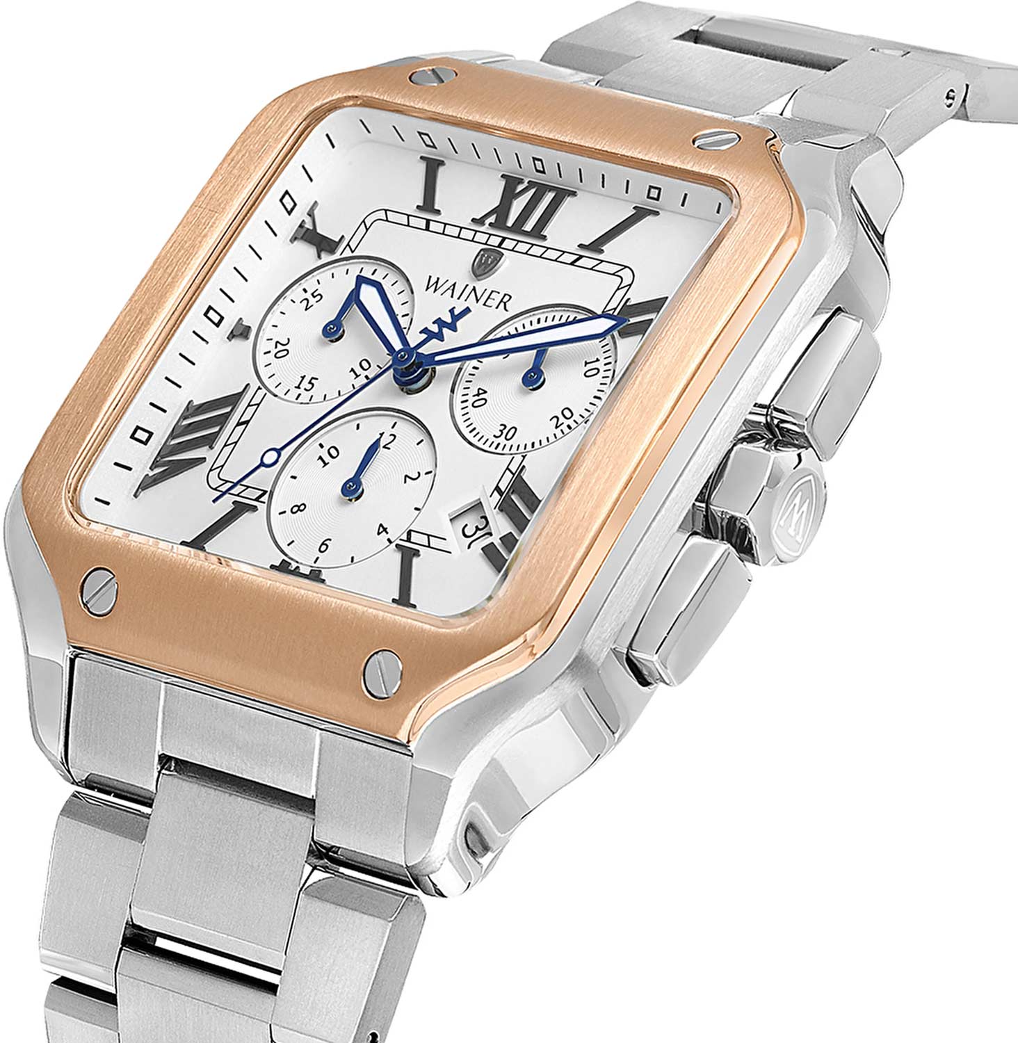 Мужские кварцевые часы Wainer WA.18090-F — это стильный аксессуар, сочетающий в себе швейцарское качество и изысканный дизайн. Модель выполнена в квадратной форме из стали 316L с частичным PVD-покрытиемPVDУльтратонкое покрытие наносится в технике вакуумного напыления, сочетает в себе нитрид титана особой прочности со слоем золота или оксида хрома. Несёт в себе декоративную или защитную функцию., что придаёт ей благородный внешний вид и устойчивость к царапинам. Корпус украшен декоративными винтами, подчёркивая внимание к деталям. Циферблат белого цвета дополнен штриховыми метками и римскими цифрами, а секундная стрелка на конце декорирована буквой W, добавляя модели индивидуальности. Защиту механизма обеспечивает сапфировое стеклоСапфировое стеклоПрочный и надёжный материал из кристалла сапфира синтетического происхождения, характеризующийся особой твёрдостью и устойчивостью к царапинам и повреждениям., устойчивое к повреждениям. Окошко даты расположено в положении 4 часов, а гранёная заводная головка с защитой оснащена фирменным логотипом. Браслет из стали 316L шириной 22 мм оснащён Раскладная застёжкаРаскладная застёжкаТакой тип застёжки используется только на браслетах из металла. Она никогда не раскрывается полностью, происходит разделение на 2 и более частей. Раскладывающая застёжка снизит вероятность потери часов к минимуму., обеспечивающей комфорт и надёжную фиксацию на запястье. Водонепроницаемость позволяет использовать модель при мытье рук или под лёгким дождём. Стрелки с люминесцентным покрытиемЛюминесцентное покрытиеПозволяет считывать показания времени в темноте. Производители наносят на стрелки, часовые индексы, безель или поверхность циферблата светонакопительный состав, дающий холодное свечение. обеспечивают отличную читаемость даже в условиях слабого освещения. Механизм калибра Ronda 5030.D гарантирует точность хода и надёжность. Эти часы станут универсальным аксессуаром для тех, кто ценит сочетание стиля, функциональности и швейцарского мастерства — идеальный выбор для повседневной носки и торжественных случаев.