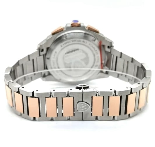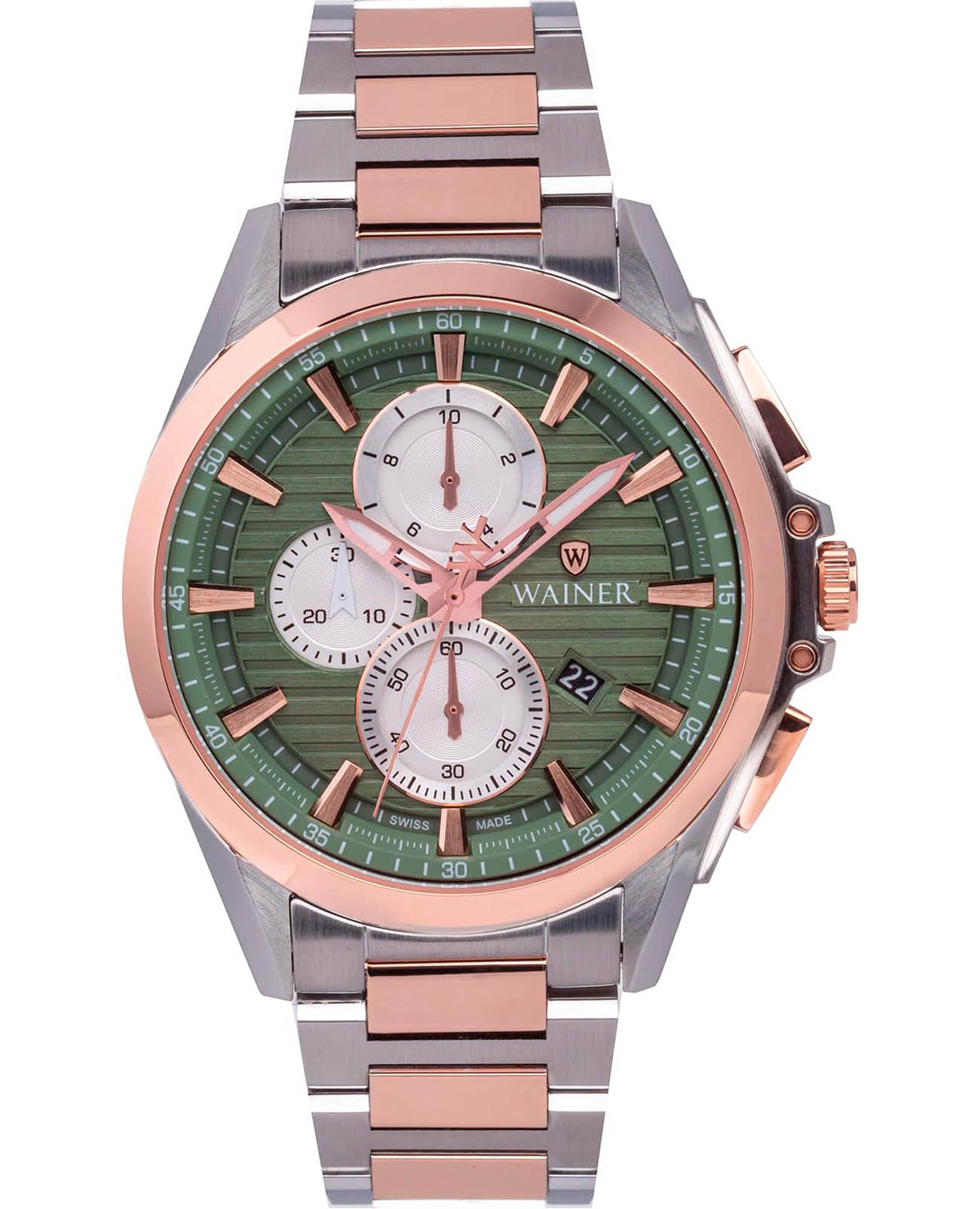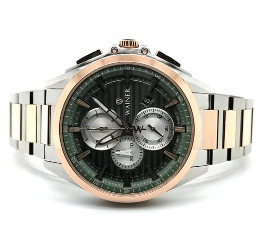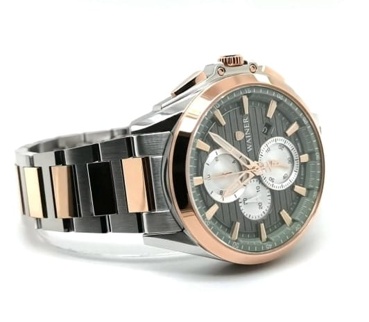 Модель Wainer WA.19401-E сочетает элегантность, швейцарское качество и функциональность. Корпус диаметром 43 мм выполнен из нержавеющей стали, а безельБезельВнешний ободок, закрепляющий стекло. В спортивных часах так называется поворотное кольцо с делениями на циферблате, выполняет роль таймера – замеряет отрезки времени на шкале. Неподвижный безель – элемент декора. Однонаправленно вращающийся безель на дайверских часах позволяет фиксировать моменты погружения и выныривания на поверхность. покрыт розовым PVD-покрытиемPVDУльтратонкое покрытие наносится в технике вакуумного напыления, сочетает в себе нитрид титана особой прочности со слоем золота или оксида хрома. Несёт в себе декоративную или защитную функцию., придающим часам стильный и утонченный внешний вид. Циферблат оформлен в классическом стиле и оснащен хронографомХронографФункция позволяет измерять отрезки времени с особой точностью: часы, минуты, секунды. Верным признаком хронографа является наличие на циферблате 3 дополнительных окошек-счётчиков. для точного измерения времени, а сапфировое стеклоСапфировое стеклоПрочный и надёжный материал из кристалла сапфира синтетического происхождения, характеризующийся особой твёрдостью и устойчивостью к царапинам и повреждениям. защищает дисплей от царапин и механических повреждений. Часы работают на надежном кварцевом механизме, обеспечивающем стабильную точность. Браслет из нержавеющей стали с розовым PVD-покрытиемPVDУльтратонкое покрытие наносится в технике вакуумного напыления, сочетает в себе нитрид титана особой прочности со слоем золота или оксида хрома. Несёт в себе декоративную или защитную функцию. гарантирует комфортное ношение и долговечность. Водонепроницаемость до 50 метров защищает часы от случайных брызг. Wainer WA.19401-E — это стильный аксессуар для мужчин, ценящих швейцарскую точность, современный стиль и функциональность.